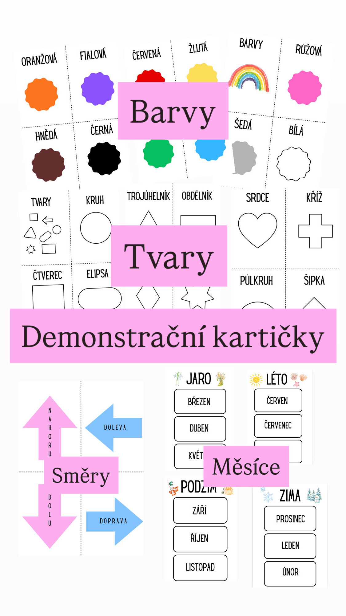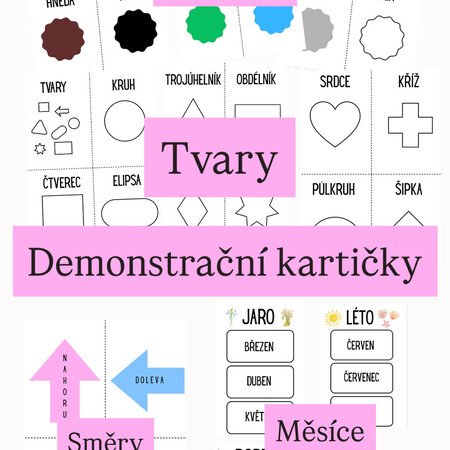 Připravila jsem soubor demonstračních kartiček ve formátu A4, přičemž na každé stránce se nacházejí čtyři kartičky, což umožňuje úsporný tisk. Soubor obsahuje kartičky zaměřené na barvy, tvary, směry a roční období s názvy měsíců..