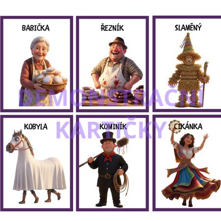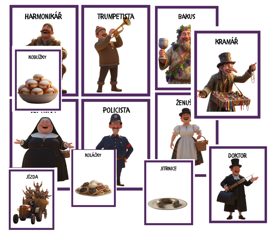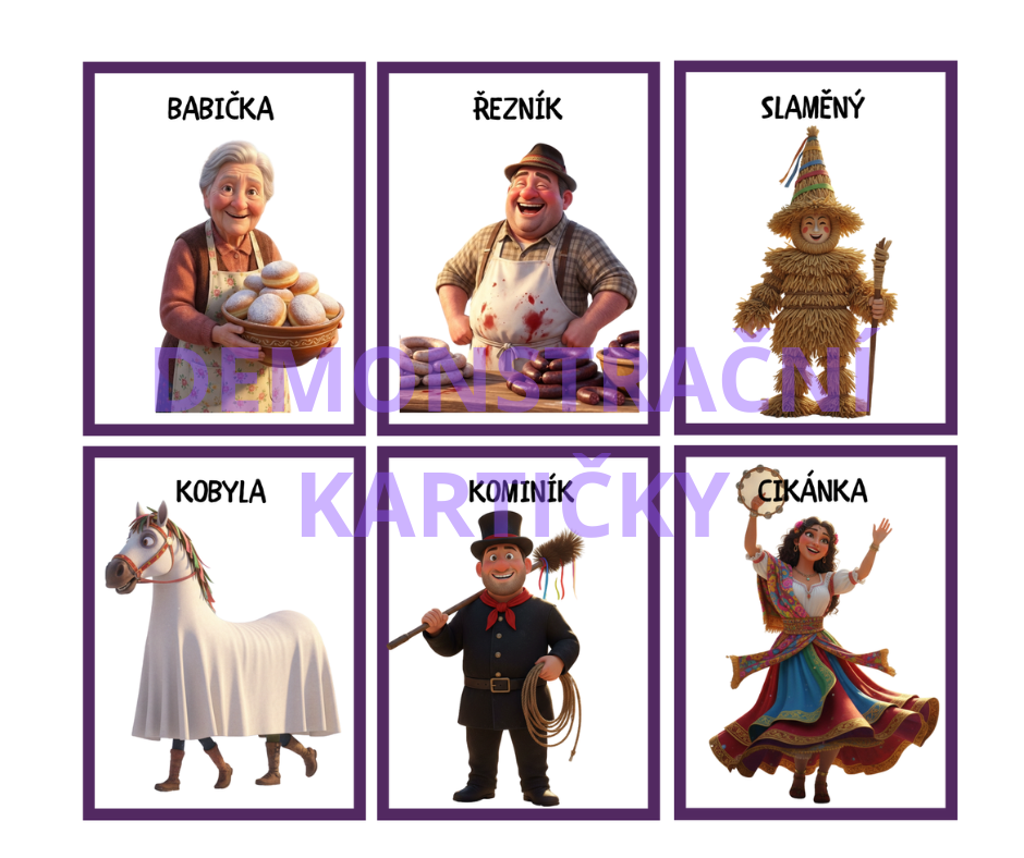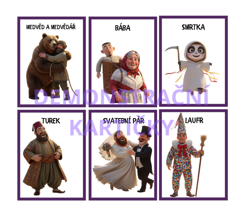 Připravila jsem pro vás sadu demonstračních kartiček, které přibližují tradici Masopustu těm nejmenším. Obrázky jsou vytvořeny v moderním 3D animovaném stylu, který děti milují. Tradice díky tomu nepůsobí jako „stará historie“, ale jako živý, barevný a veselý příběh, do kterého chtějí vstoupit.