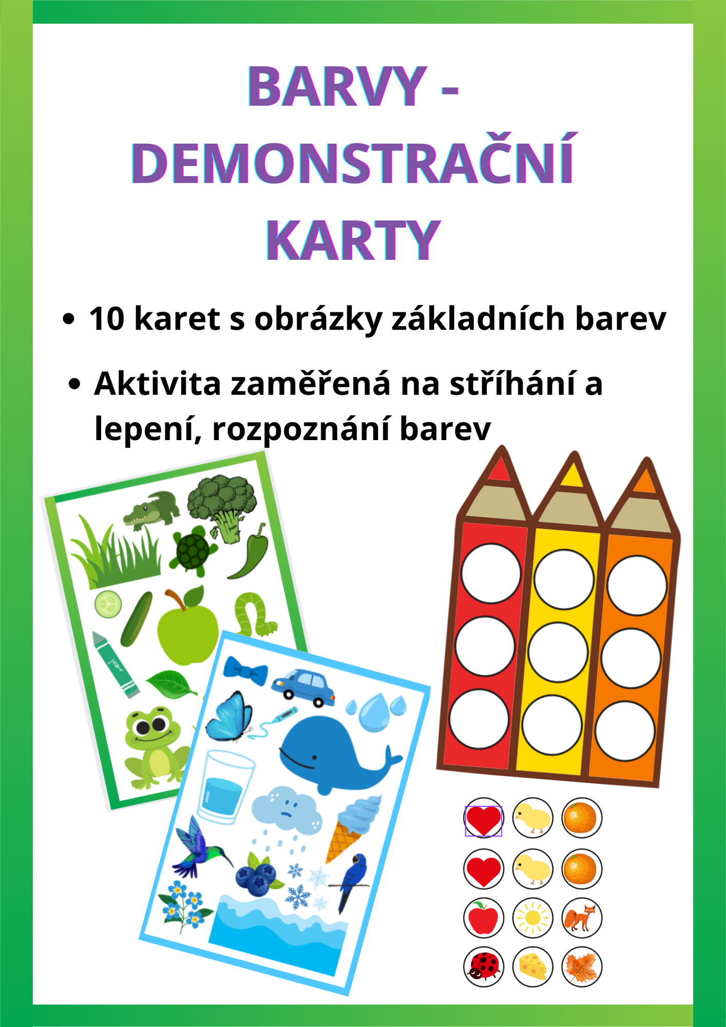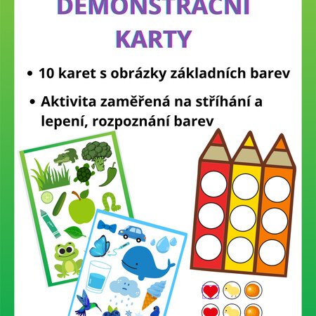 Demonstrační karty základních barev. Soubor obsahuje 10 A4 stránek s obrázky typickými pro danou barvu a aktivitu zaměřenou na stříhání a lepení, rozpoznání barev - vystřihnutí obrázku a nalepení podle barvy do správné tužky.