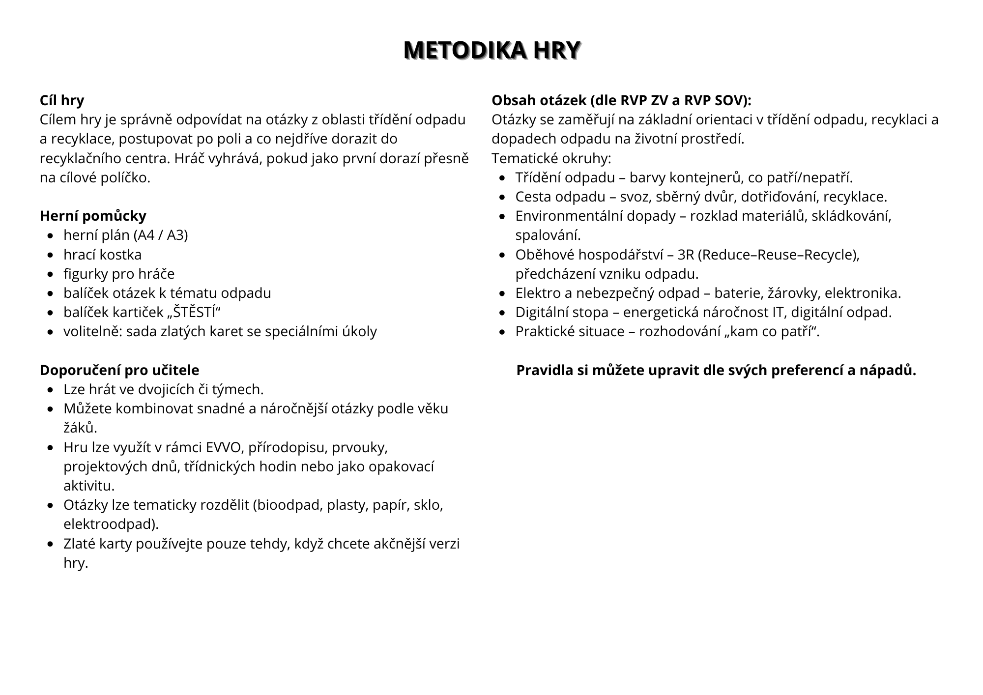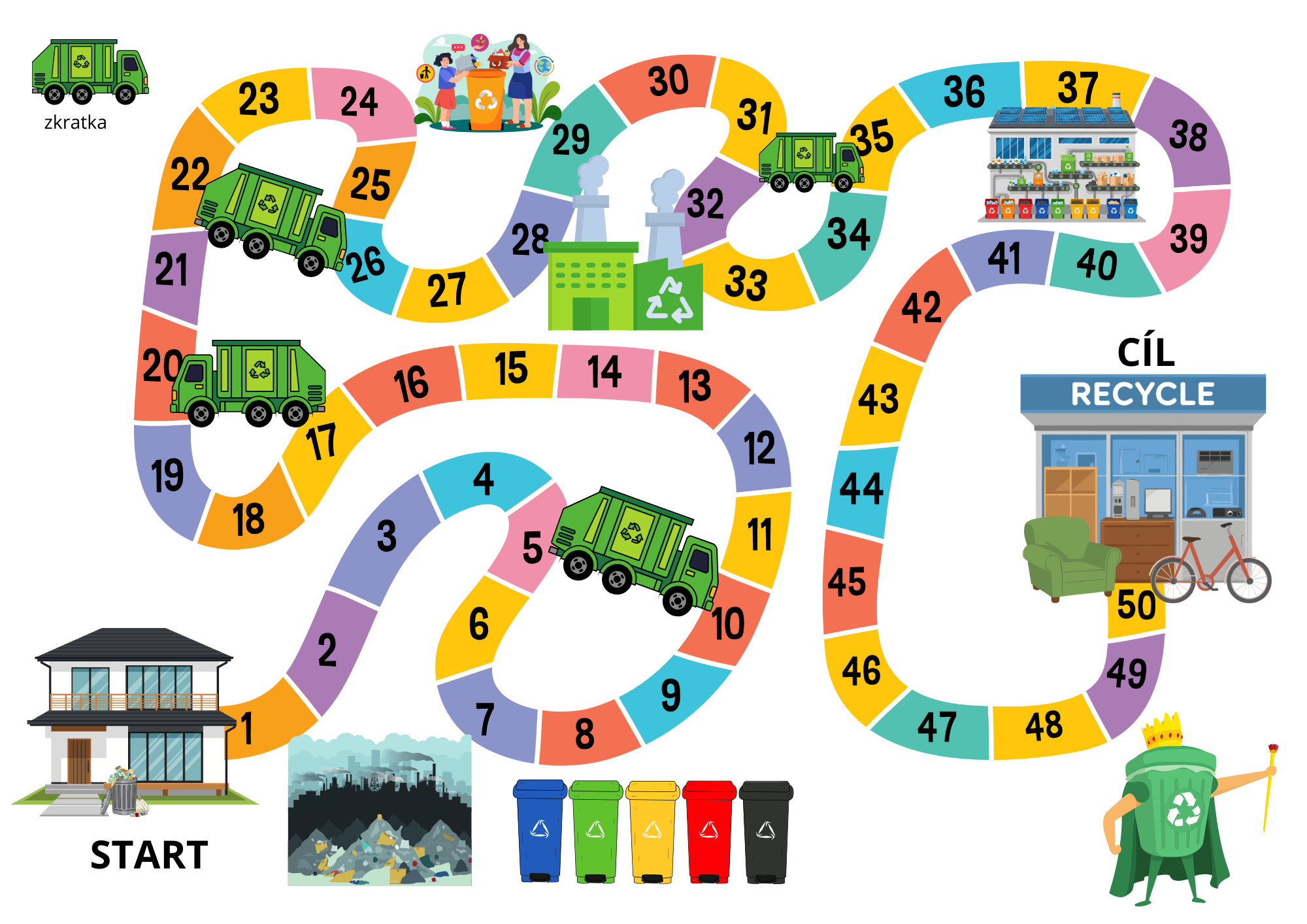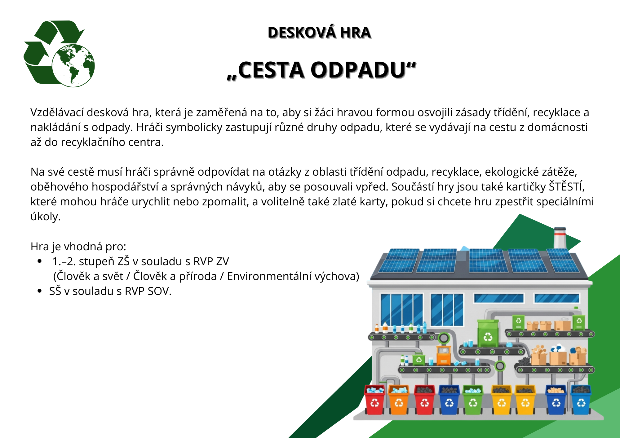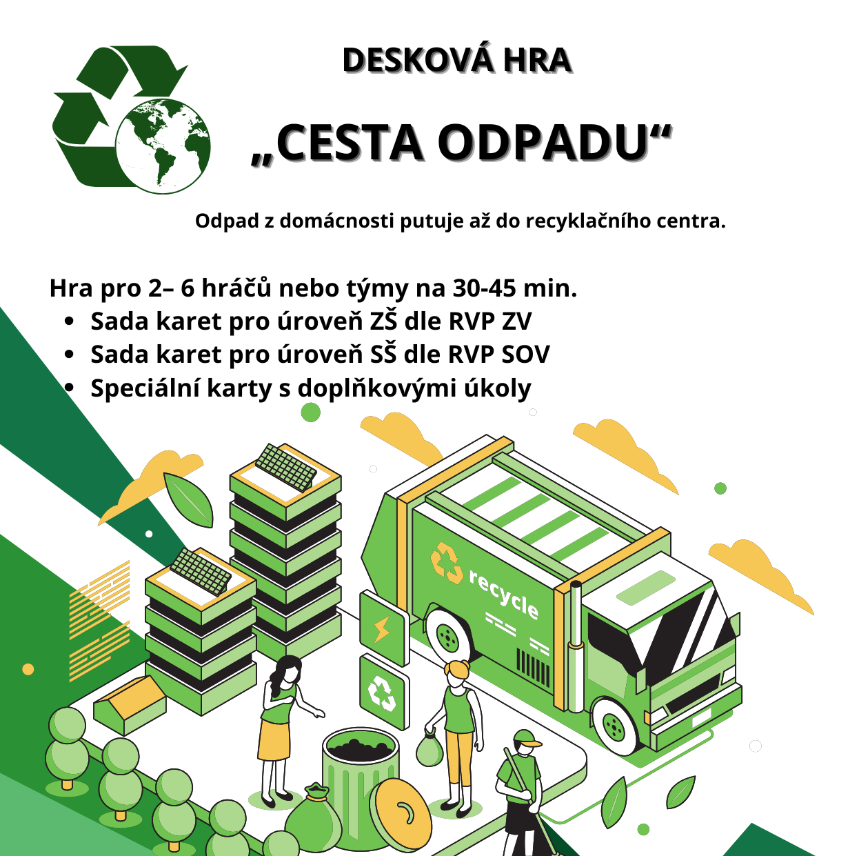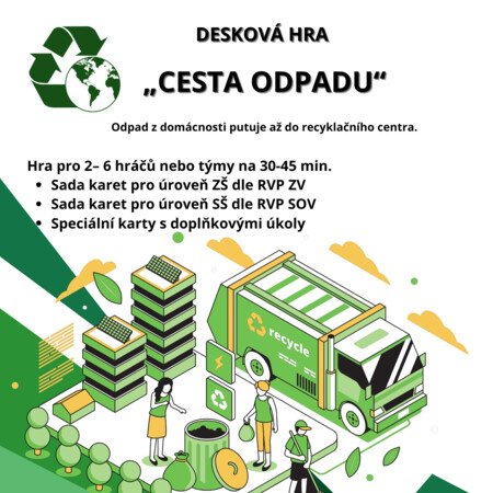 Desková hra Cesta odpadu je vzdělávací aktivita pro ZŠ zaměřená na třídění, recyklaci a porozumění celému životnímu cyklu odpadu. Hráči putují od domácnosti až k recyklačnímu centru, plní úkoly, odpovídají na otázky a řeší herní situace vycházející z praxe. Hra rozvíjí environmentální gramotnost, spolupráci i strategické myšlení a je ideální pro výuku EVVO, projektové dny či skupinovou práci.