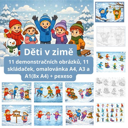 Soubor obsahuje 11 demonstračních obrázků, které vaši třídu mohou provázet při povídání a učení o zimě. Na obrázcích jsou děti při zimních hrách, sportech a při péči o zvířata. Skládačky (11 + 11) kopírují demonstrační obrázky, pomáhají tak k ucelenému zapamatování a rozvíjí zrakové vnímání. Omalovánka je ve formátu A4 pro individuální práci, A3 pro práci ve dvojicích velkoformátová omalovánka, která sestavením 4 obrázků A4 vytvoří jednu velkou A2 lze ještě rozdělit na A5 pro 8 dětí. Omalovánky rozvíjí jemnou motoriku a kooperativní schopnosti. Pexeso opět vychází z demonstračních obrázků. Pro získání duplicitních karet je potřeba kartu s obrázky vytisknout dvakrát.