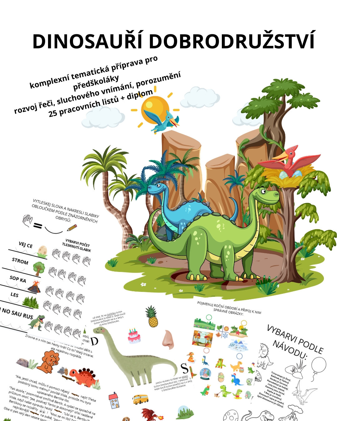 -soubor 25 pracovních listů s oblíbeným tématem dinosaurů určený pro předškoláky.