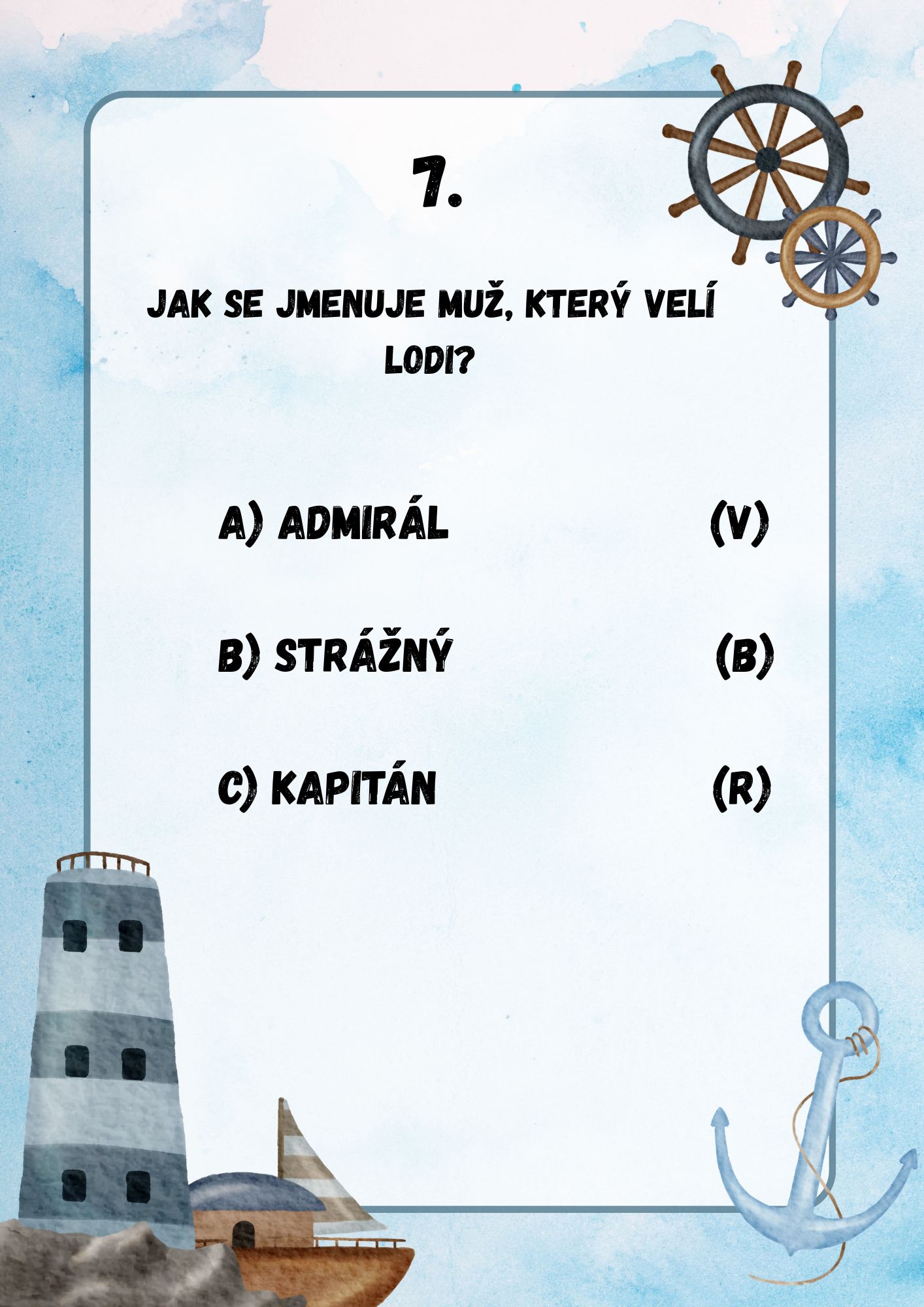 - 9 otázkových listů: Karty s jednoduchými otázkami a výběrem ze tří možností (A, B, C) zaměřené na námořnické reálie.