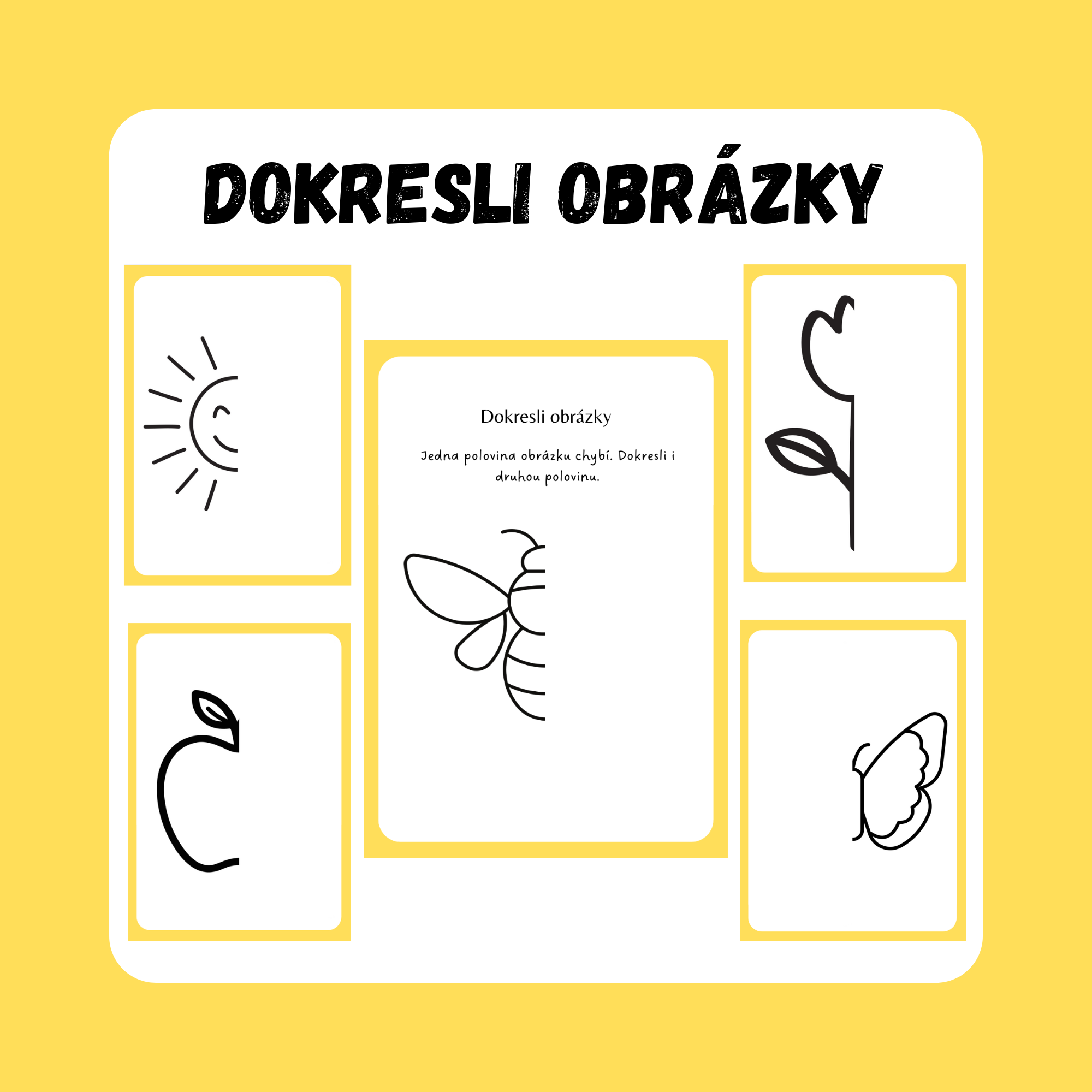 Tento soubor obsahuje pracovní listy zaměřené na dokreslování druhé poloviny obrázku. Děti pozorují tvar, vnímají symetrii a snaží se obrázek dokončit podle předlohy.
