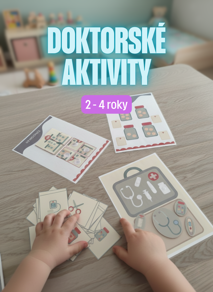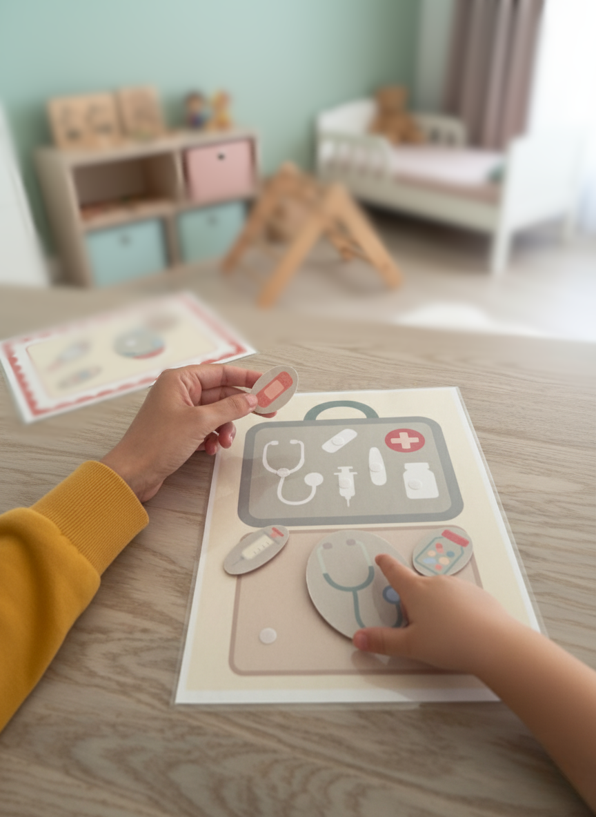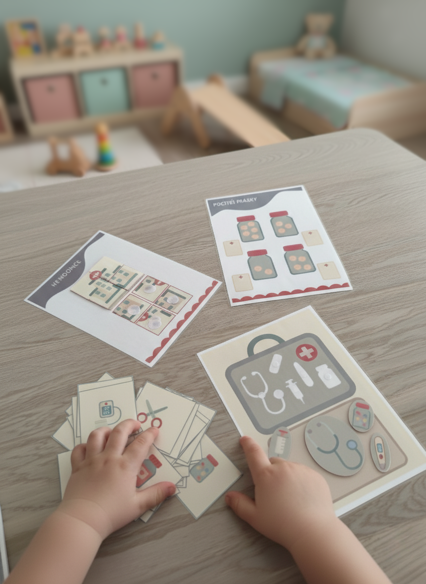- Hra „Na doktora“ – dítě ošetřuje plyšáky nebo rodiče a používá kartičky jako pomůcky.