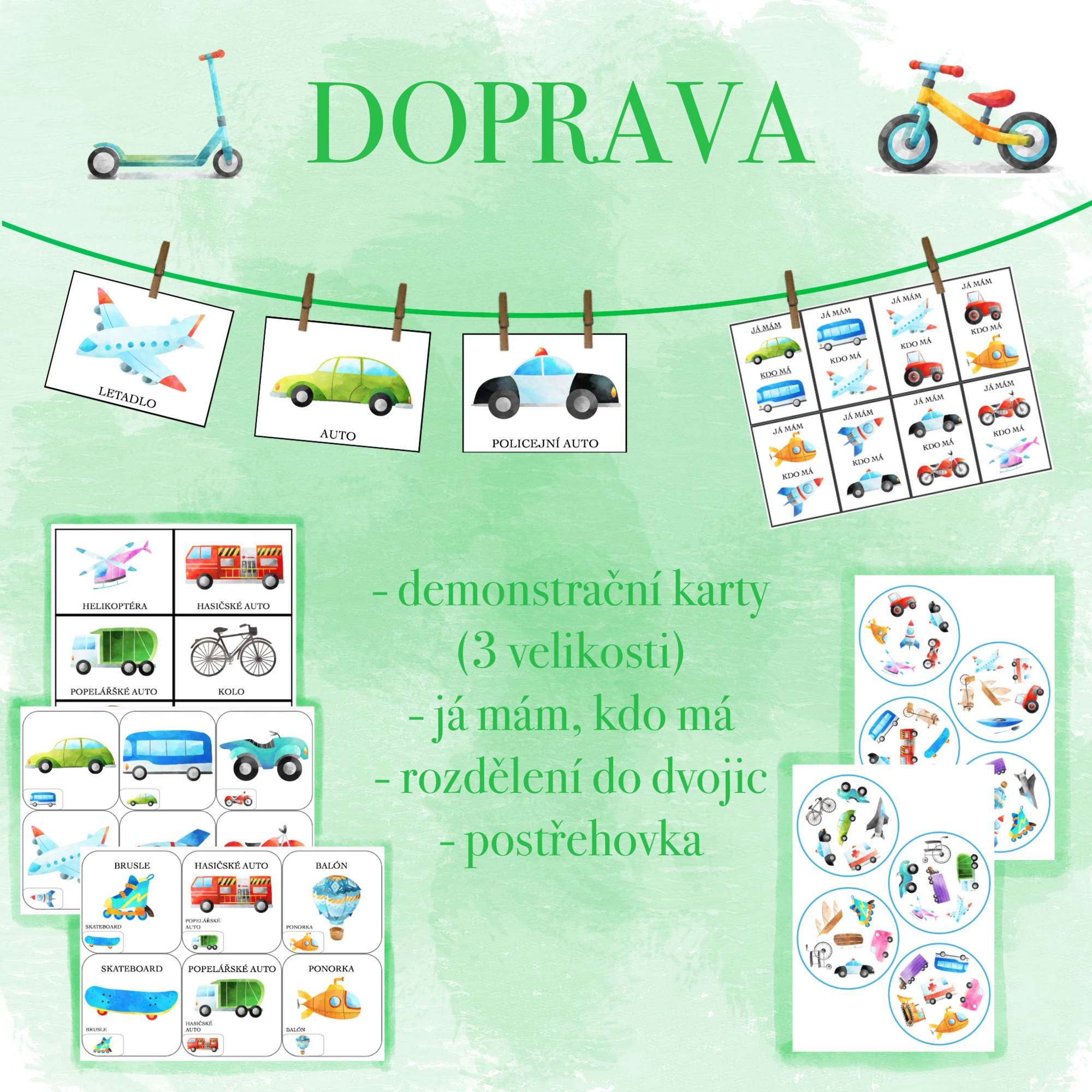 Tento soubor obsahuje dopravní aktivity. Najdete zde demonstrační karty, postřehovku a hru - já mám, kdo má. Činnosti lze využít při ranních činnostech nebo je zařadit kdykoliv během dne.