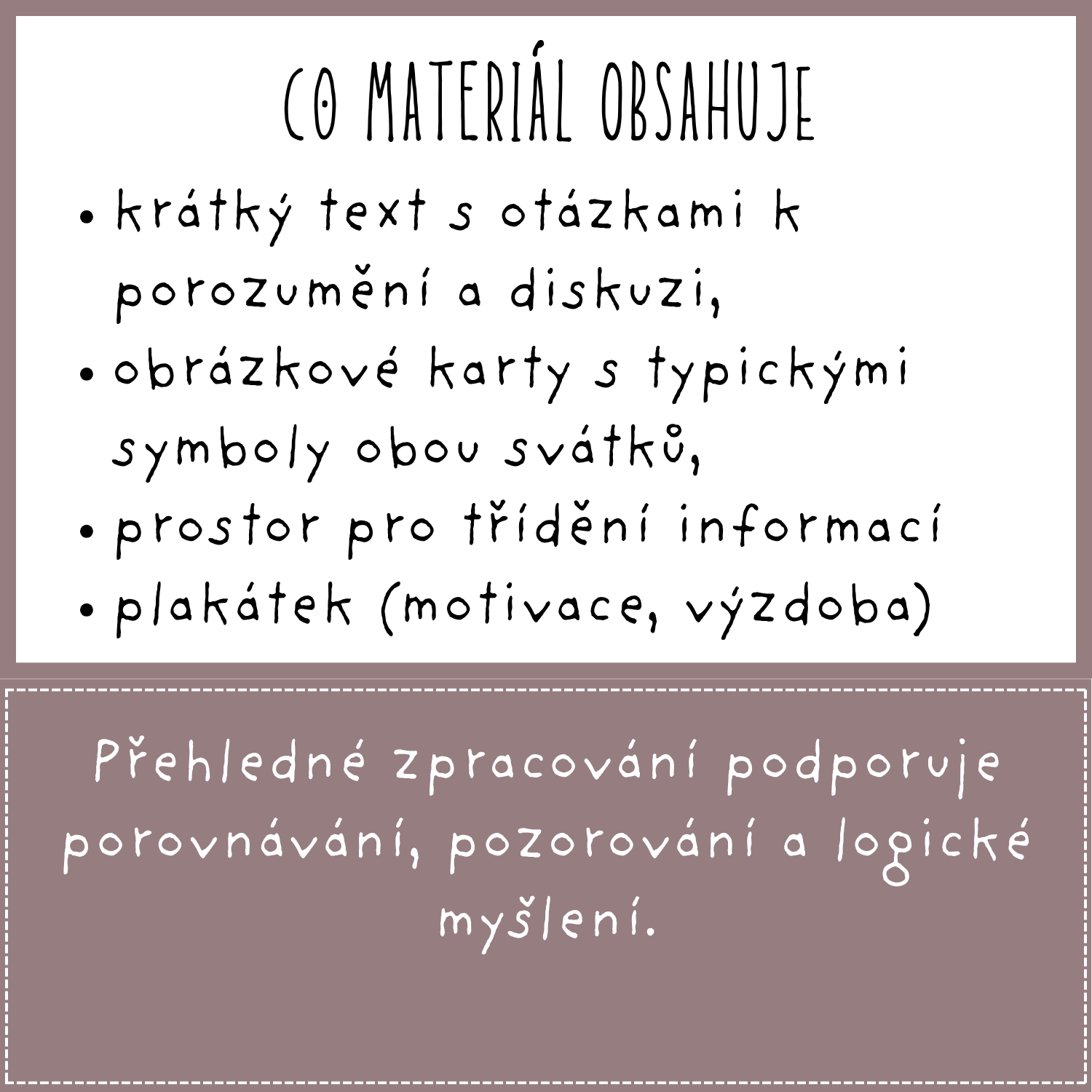 Zábavný a přehledný materiál, který pomůže prvňáčkům porozumět rozdílům i podobnostem mezi svátkem Dušiček a Halloweenem.
