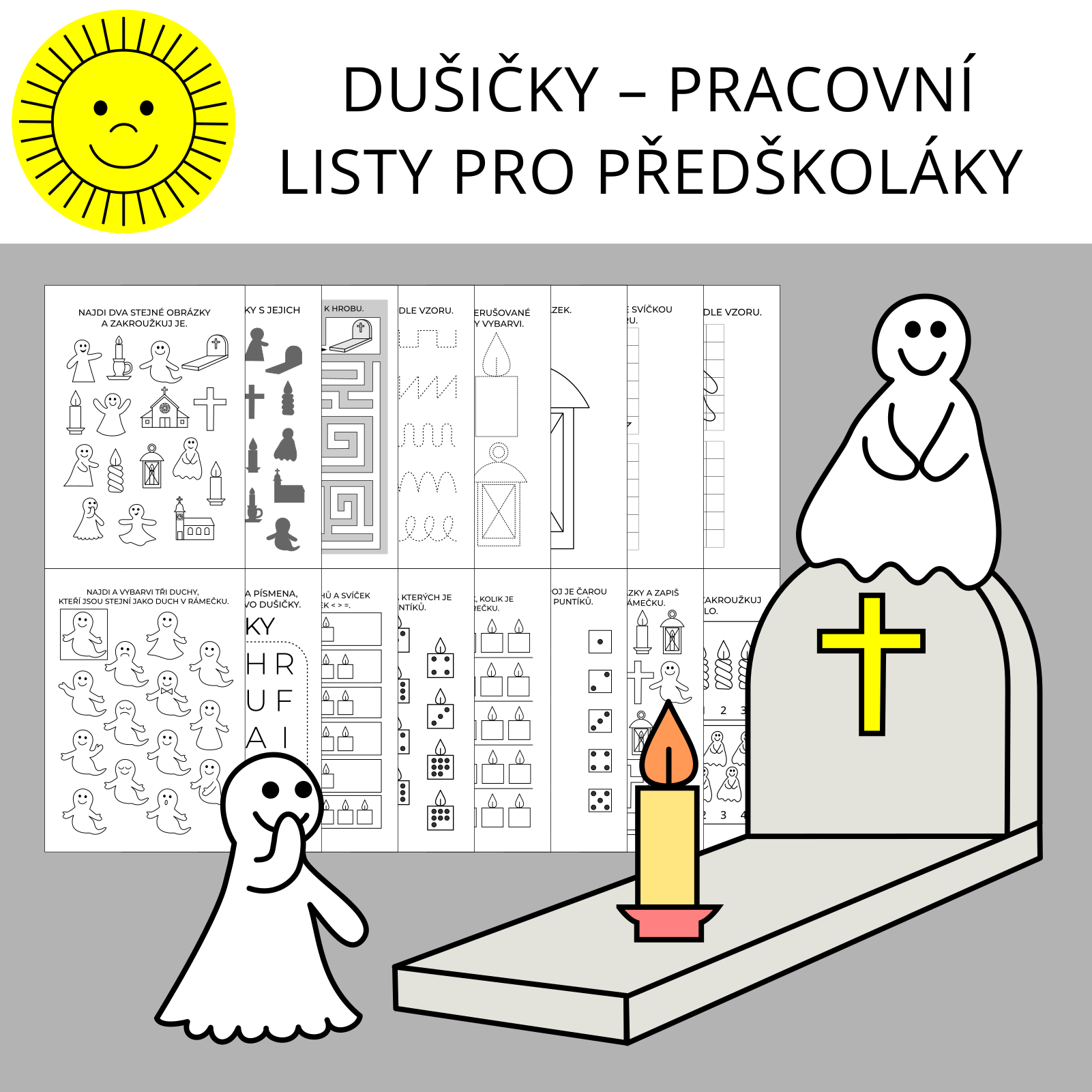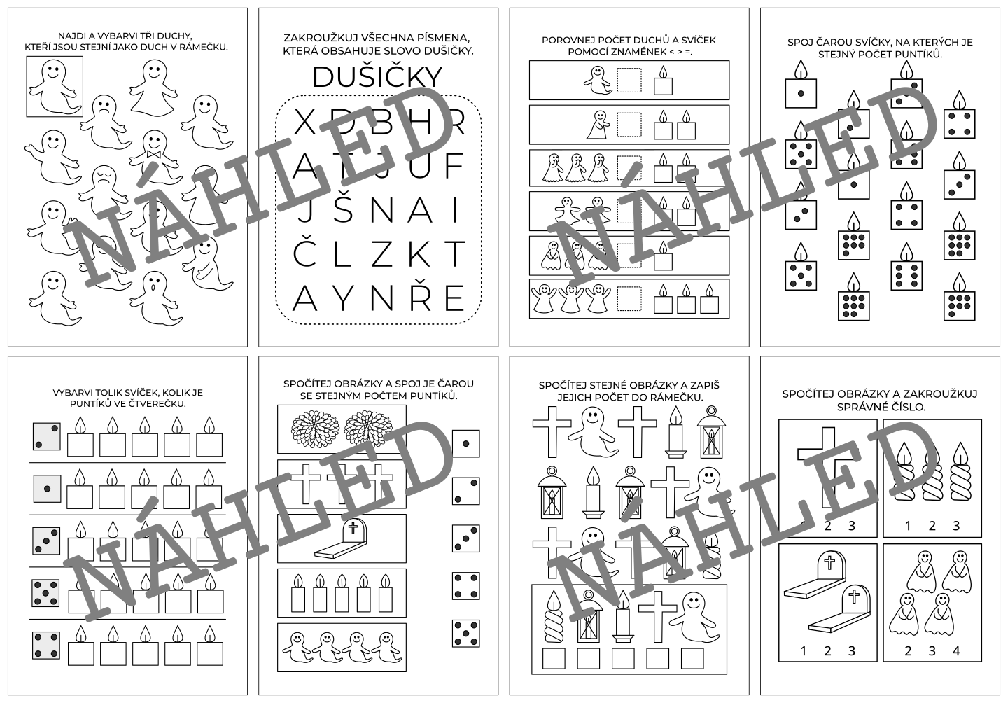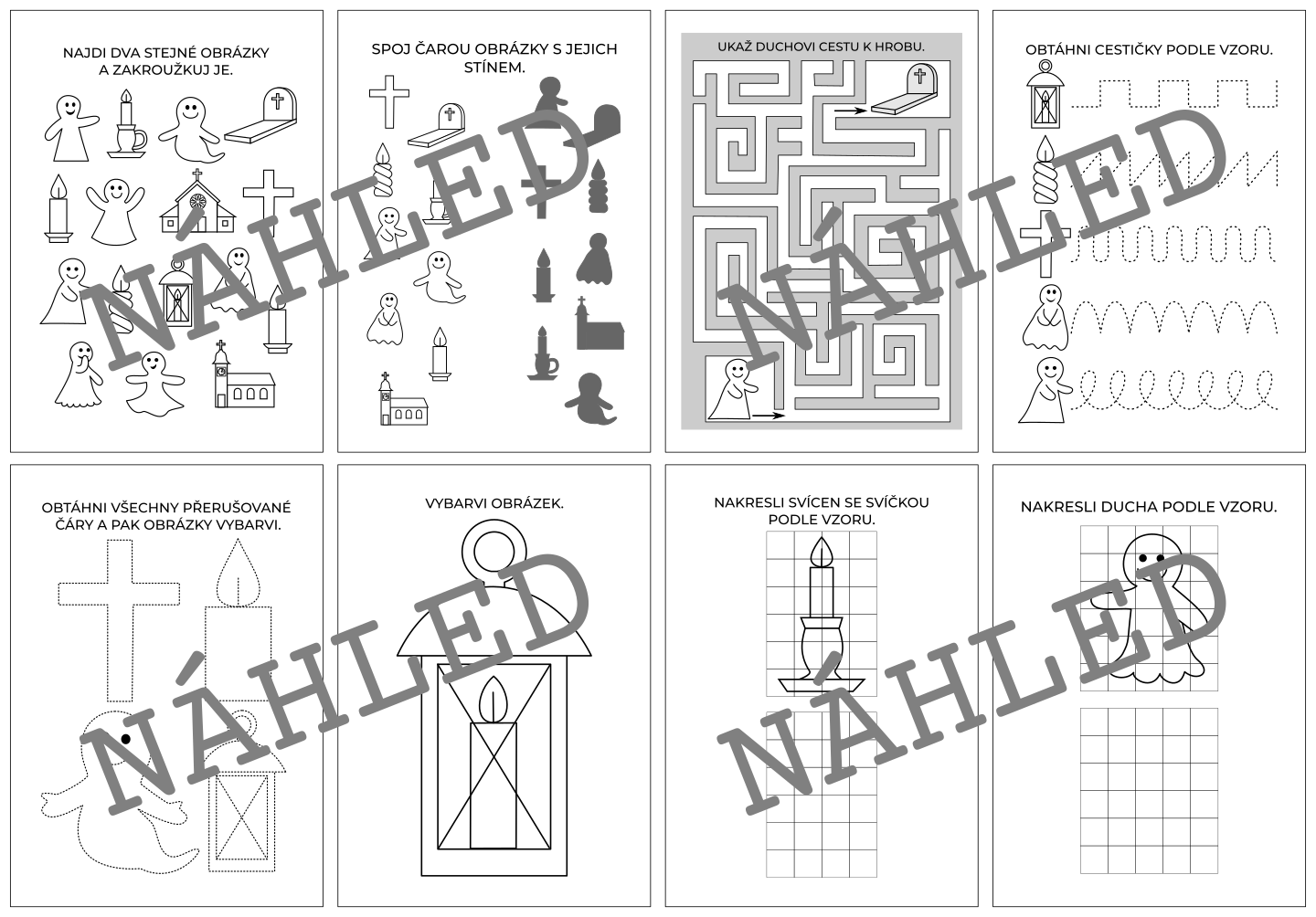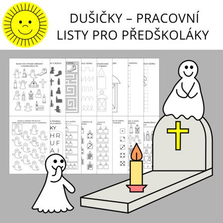 Materiál obsahuje 16 černobílých pracovních listů na téma Dušičky.
