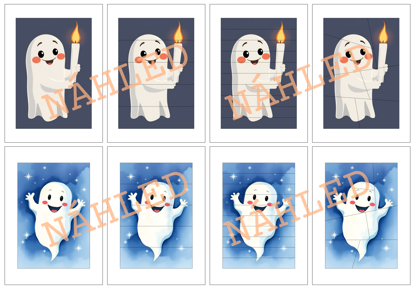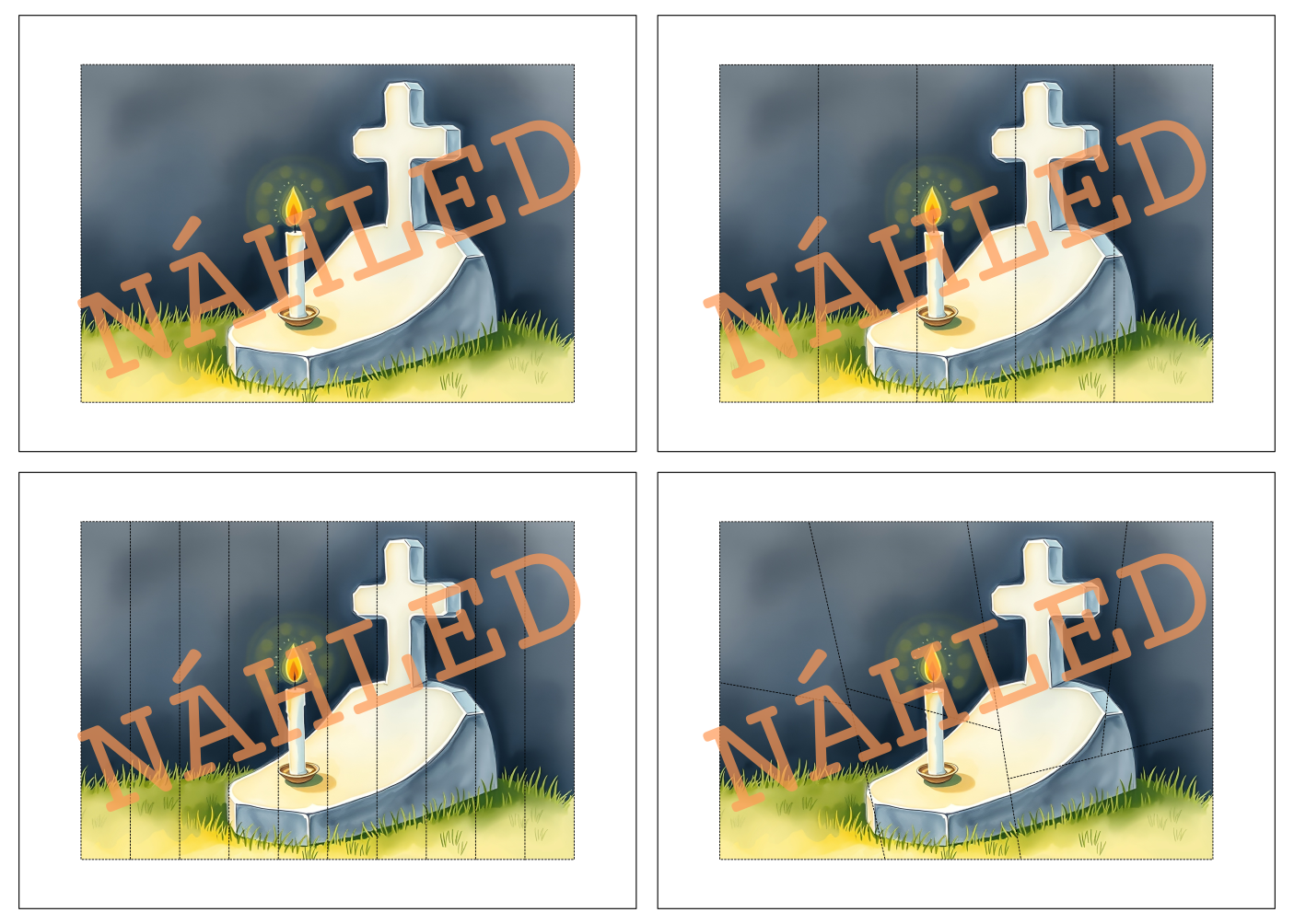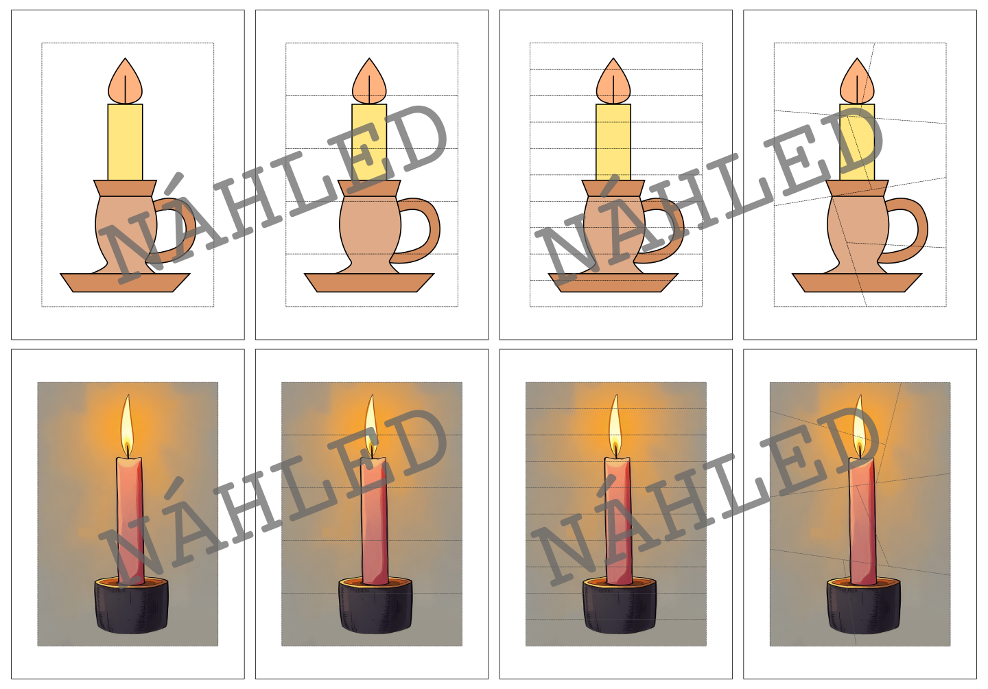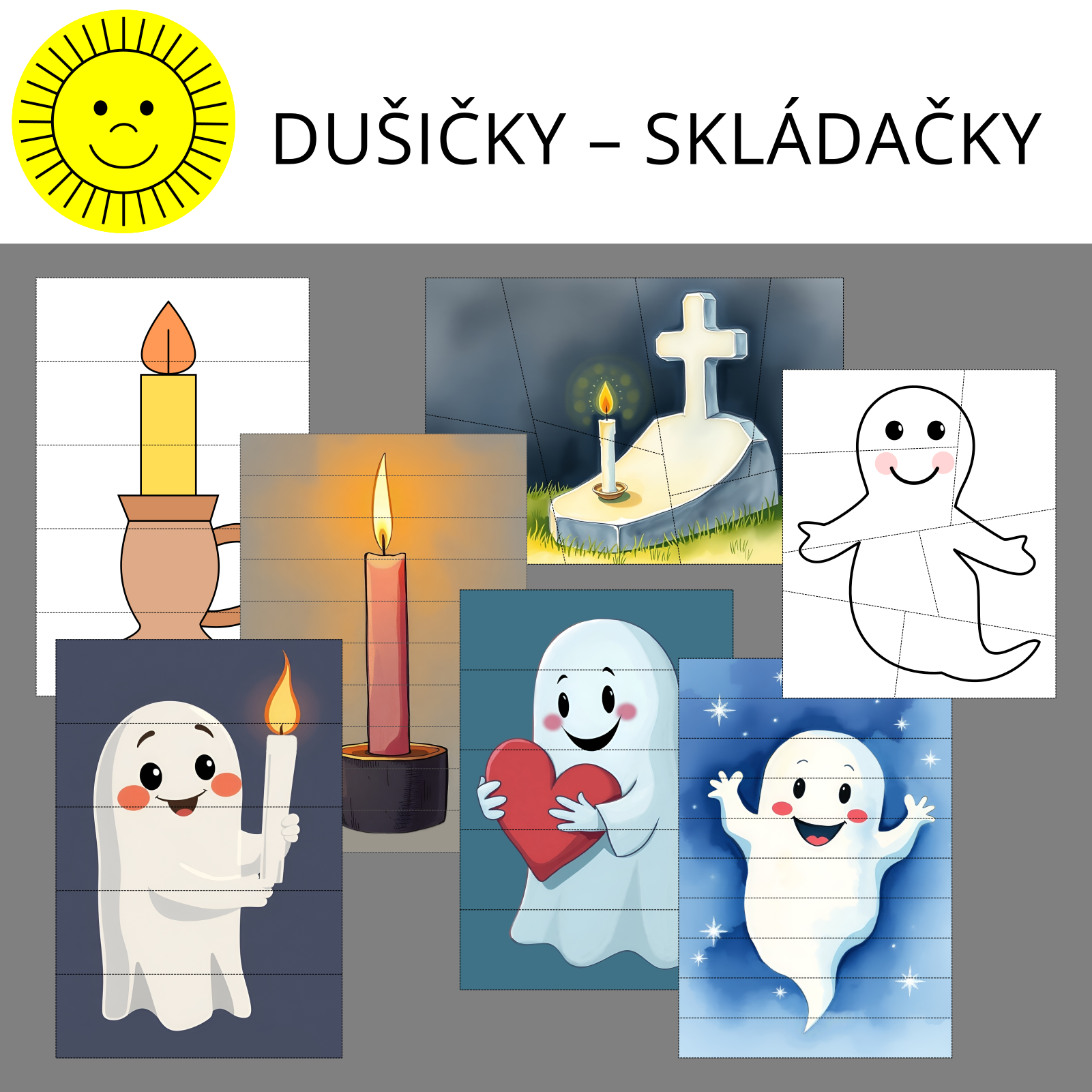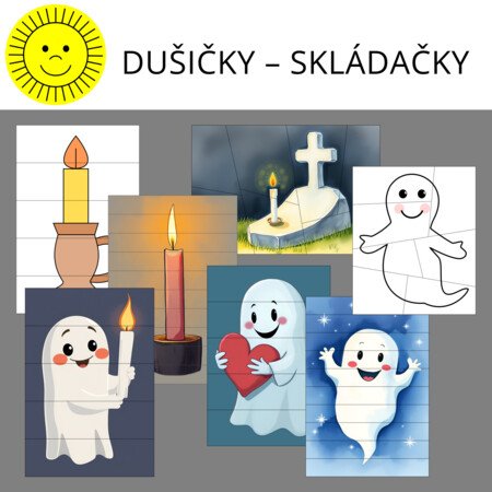 Materiál obsahuje skládačky sedmi obrázků týkajících se Dušiček (2x svíčka ve svícnu, 1x hrob se svíčkou, 4x duch). Ke každému náhledovému obrázku jsou vytvořeny tři různě obtížné verze skládačky.