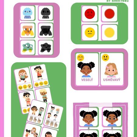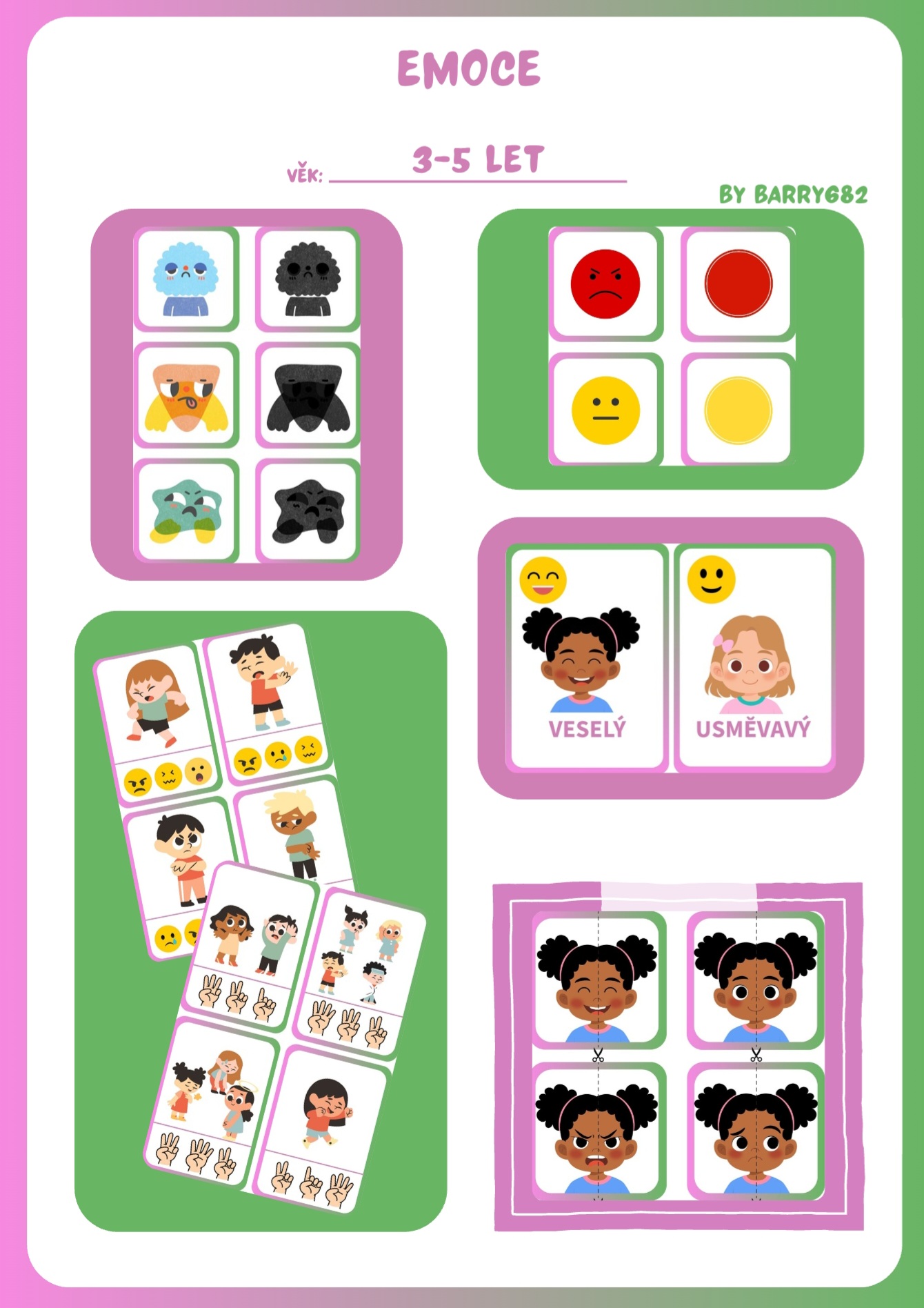 Soubor obsahuje: stíny, barvy, skládačky, počty do 4, určování emocí dle obrázků a demonstrační karty