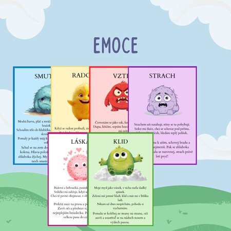 Každá kartička obsahuje jednoduchý popis emoce a také pohybovou činnost, která pomůže si s danou emocí poradit a zvládnout ji.