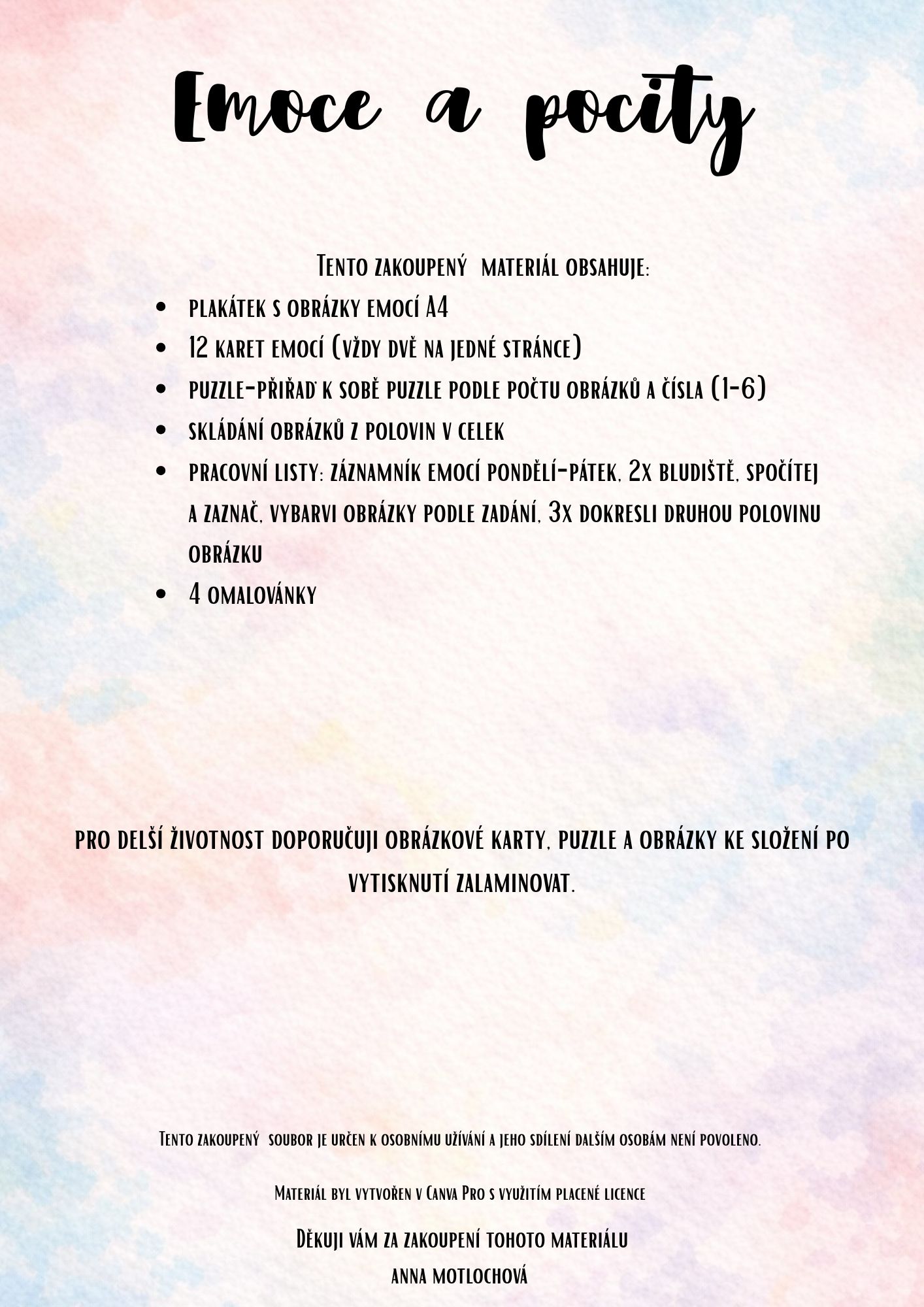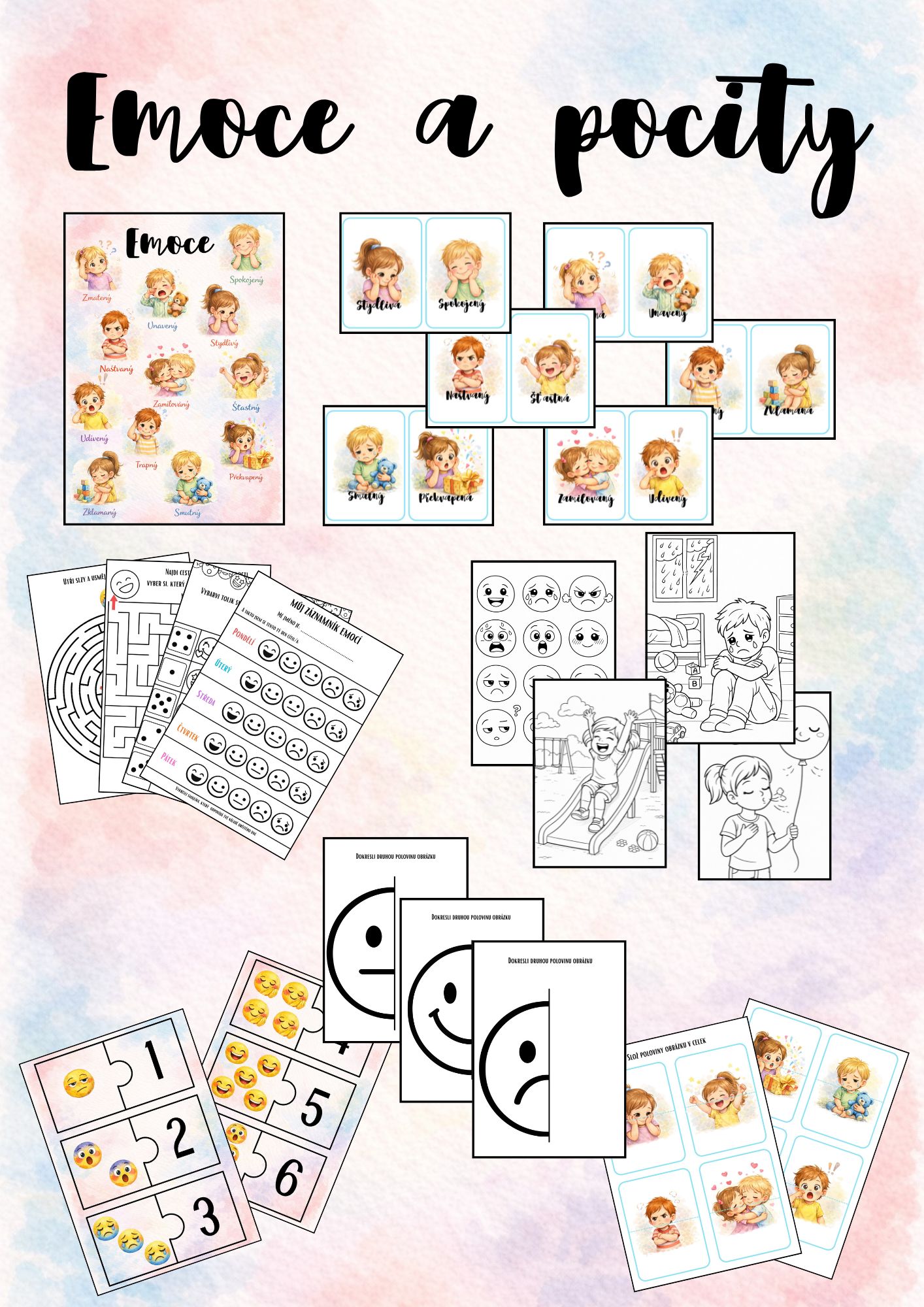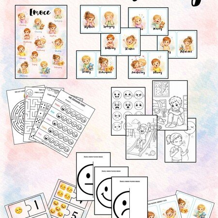 Soubor obsahuje 12 obrázkových karet emocí i s jejich názvy, skládání puzzle podle čísel, skládání obrázků, pracovní listy a omalovánky.