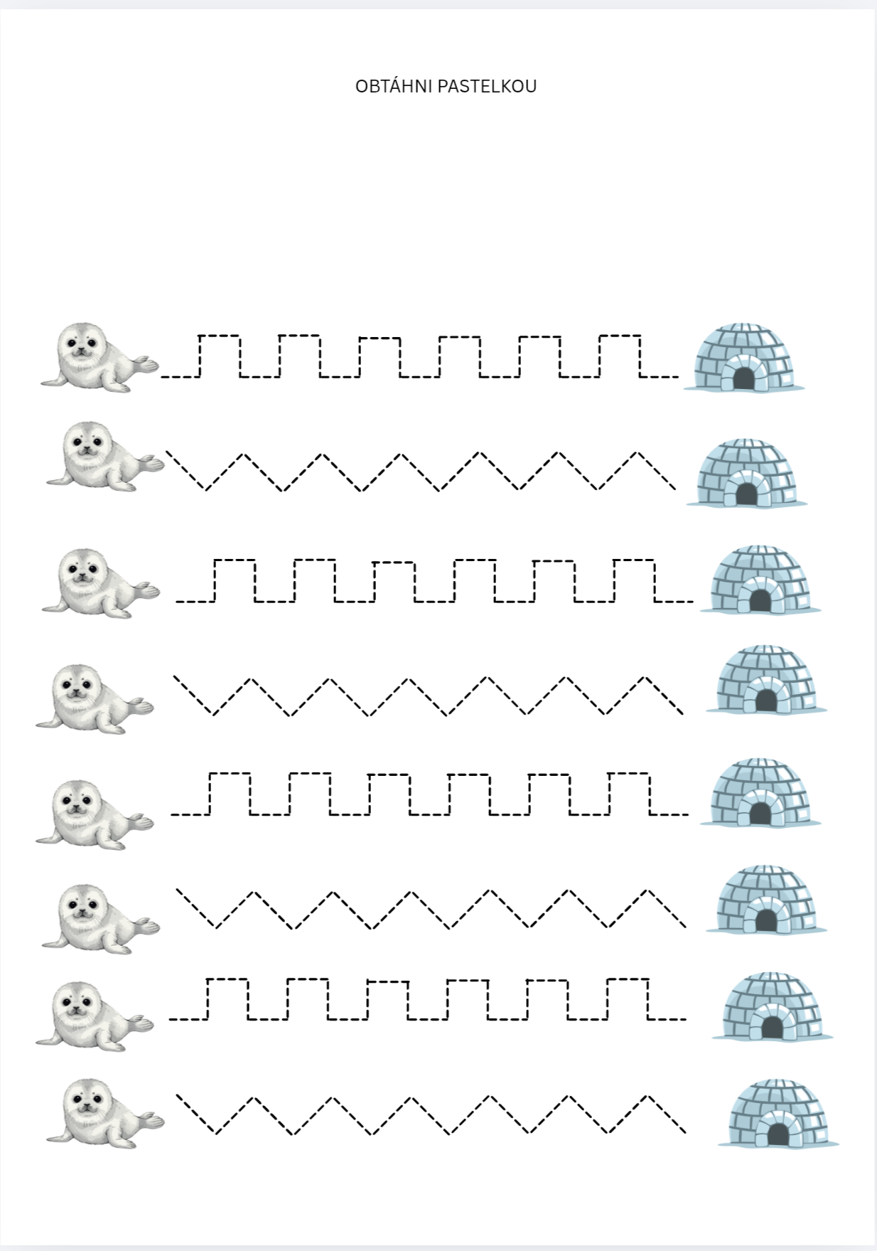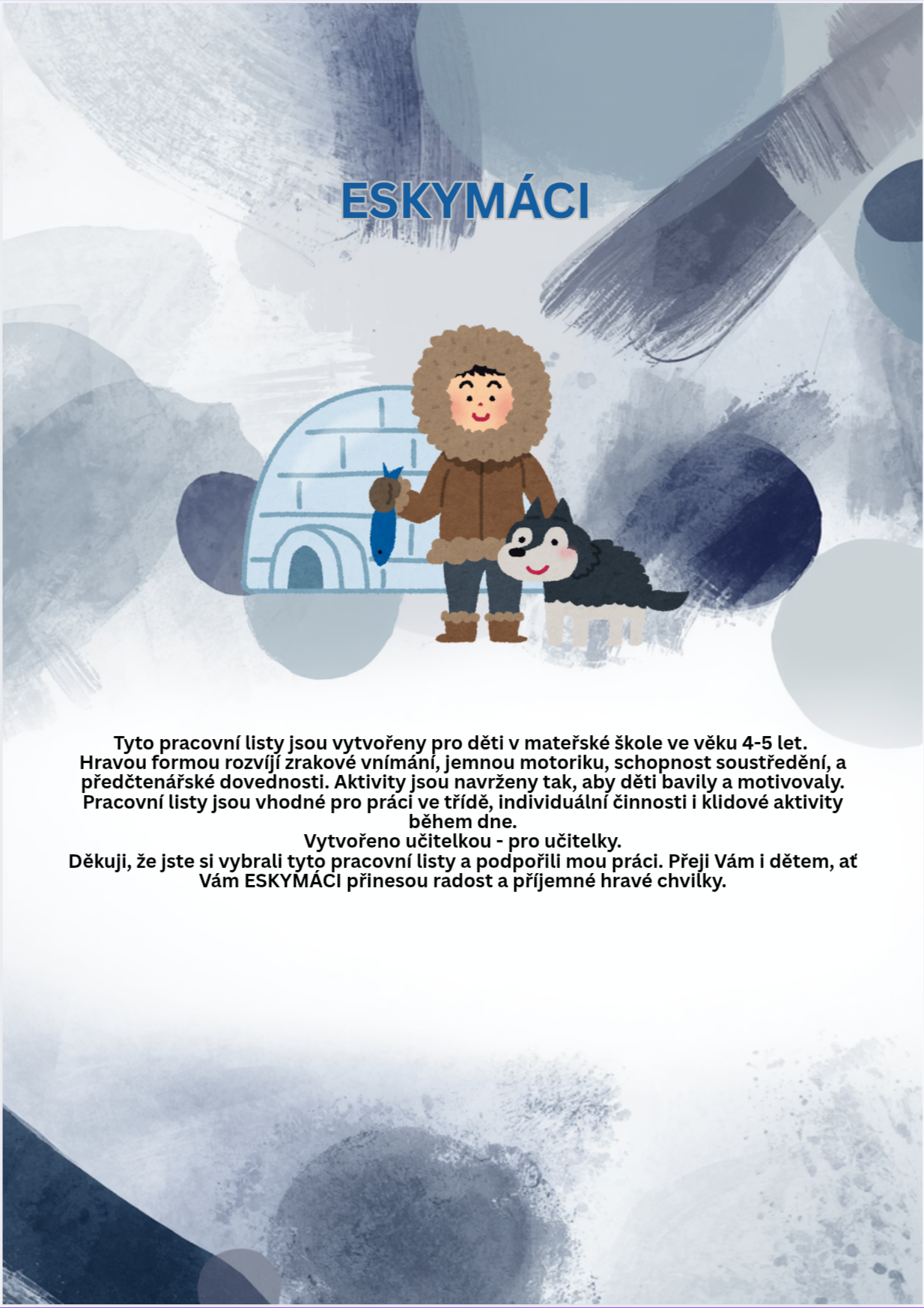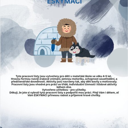 Tyto pracovní listy jsou vytvořeny pro děti v mateřské škole ve věku 4-5 let. Hravou formou rozvíjí zrakové vnímání, jemnou motoriku, schopnost soustředění, a předčtenářské dovednosti. Aktivity jsou navrženy tak, aby děti bavily a motivovaly. Pracovní listy jsou vhodné pro práci ve třídě, individuální činnosti i klidové aktivity během dne. Vytvořeno učitelkou - pro učitelky. Děkuji, že jste si vybrali tyto pracovní listy a podpořili mou práci. Přeji Vám i dětem, ať Vám ESKYMÁCI přinesou radost a příjemné hravé chvilky.