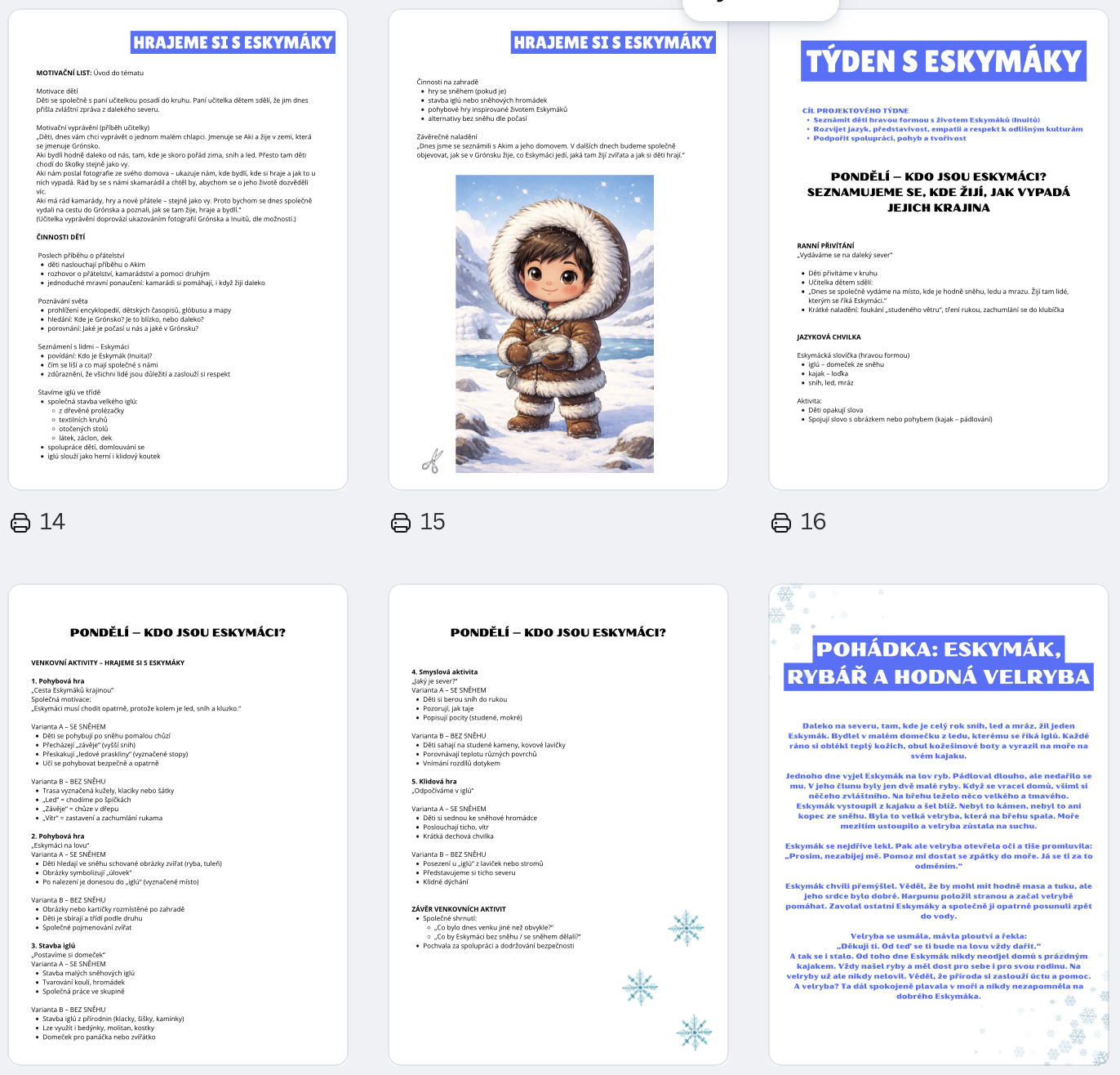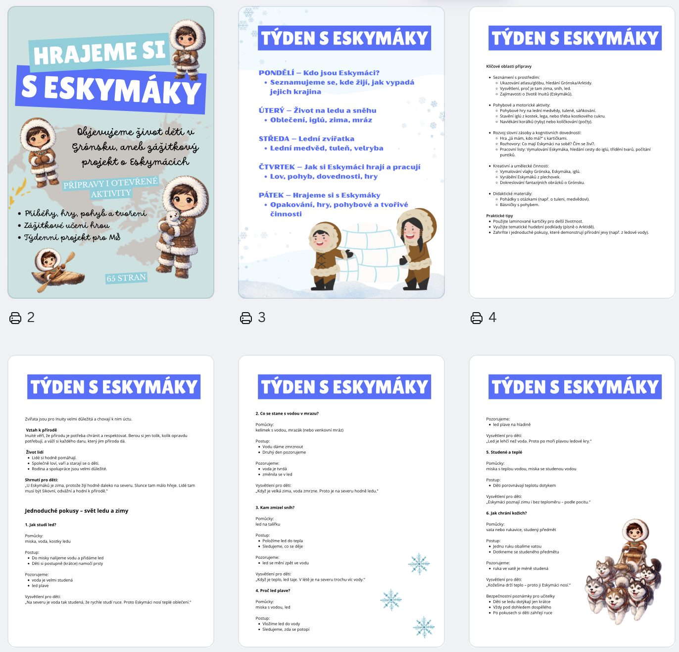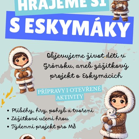 Bohatý tematický projekt, který děti hravou a prožitkovou formou seznamuje se životem dětí v Grónsku. Prostřednictvím příběhů, pohybu, tvoření a her děti objevují svět Eskymáků, jejich kulturu, zvířata, obydlí i každodenní život.