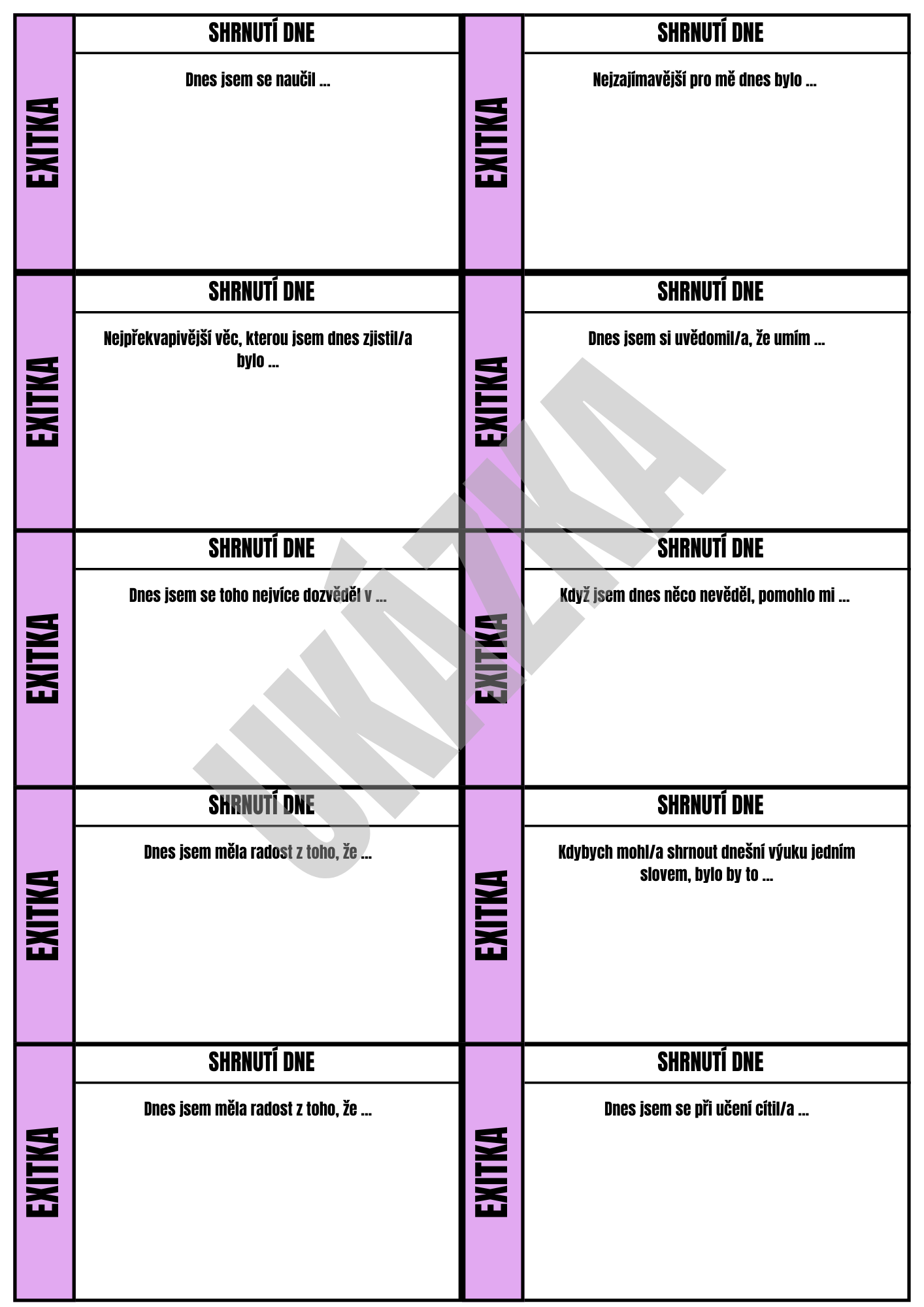 Exitky slouží jako rychlá forma reflexe na konci hodiny, dne či výukového bloku. Stačí je pouze vytisknout, nastříhat a rozdat žákům.