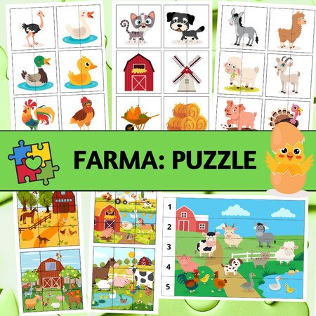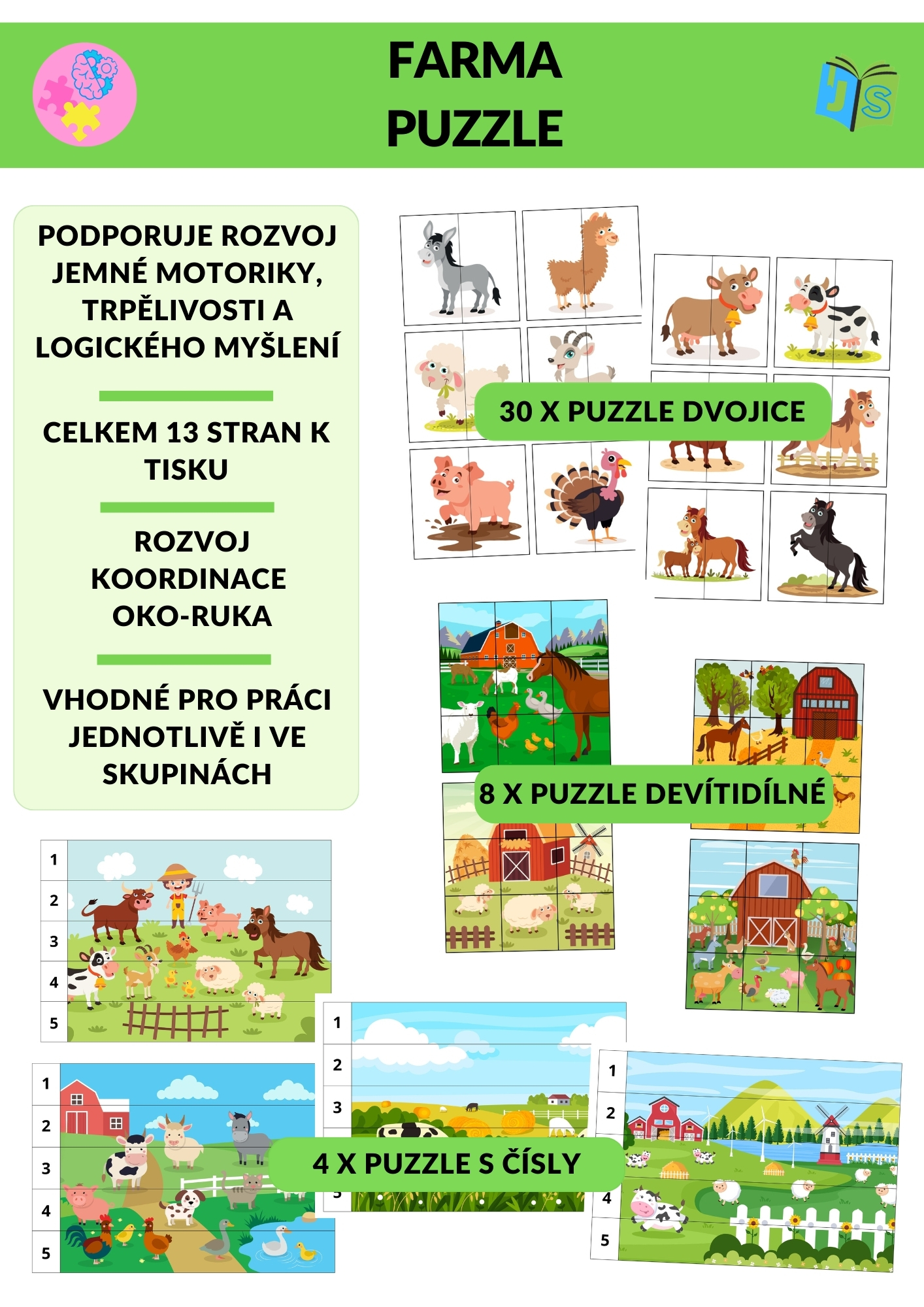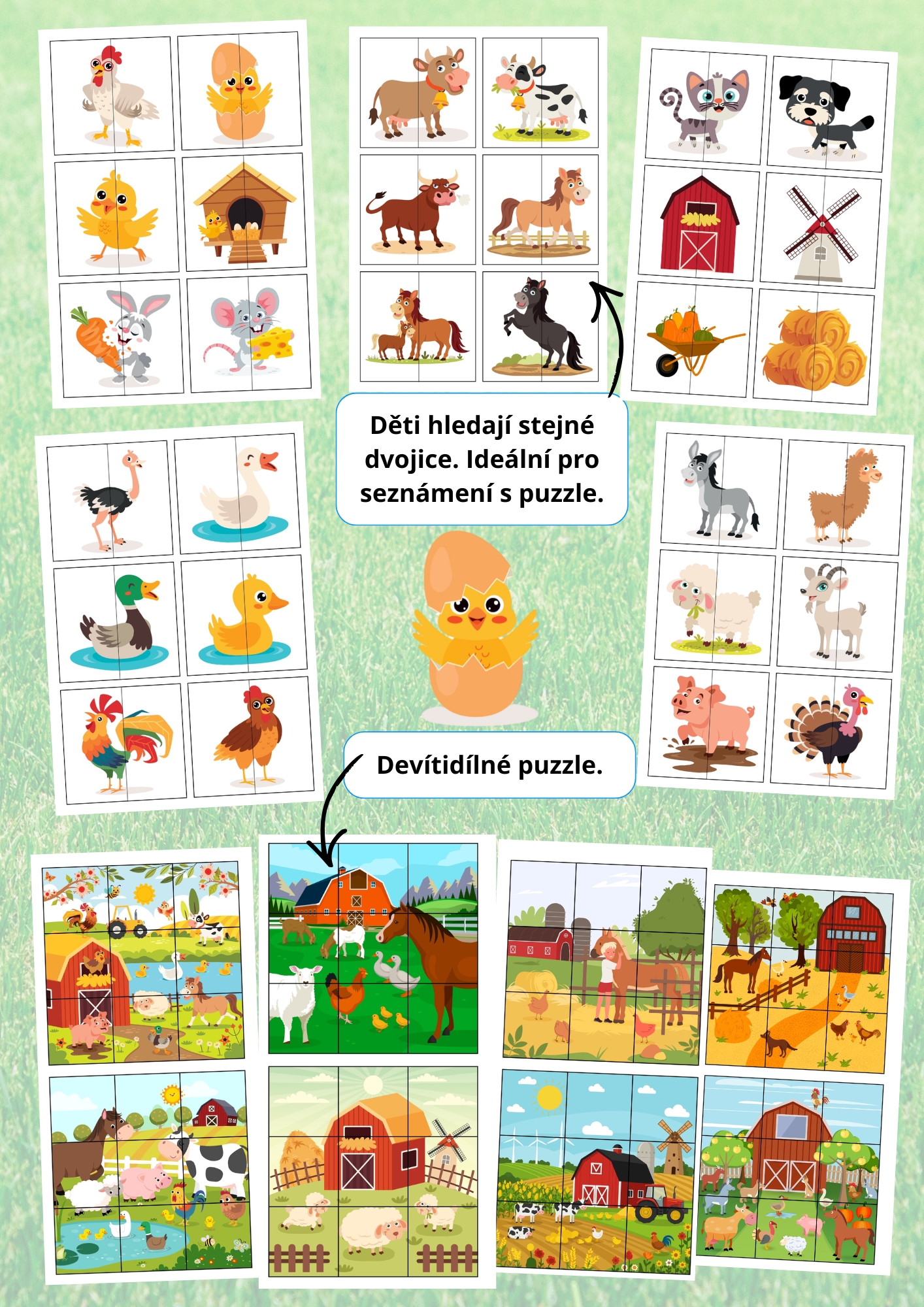 Farma puzzle je aktivita zaměřená na rozvoj vizuální percepce, pozornosti, logického myšlení a jemné motoriky u dětí předškolního a mladšího školního věku. Materiál nabízí tři typy puzzle úkolů různé náročnosti – párování obrázků, skládání devítidílného puzzle a skládání obrázků podle čísel 1–5.