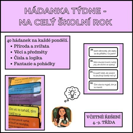 40 kartiček s hádankami na každý týden školního roku.
