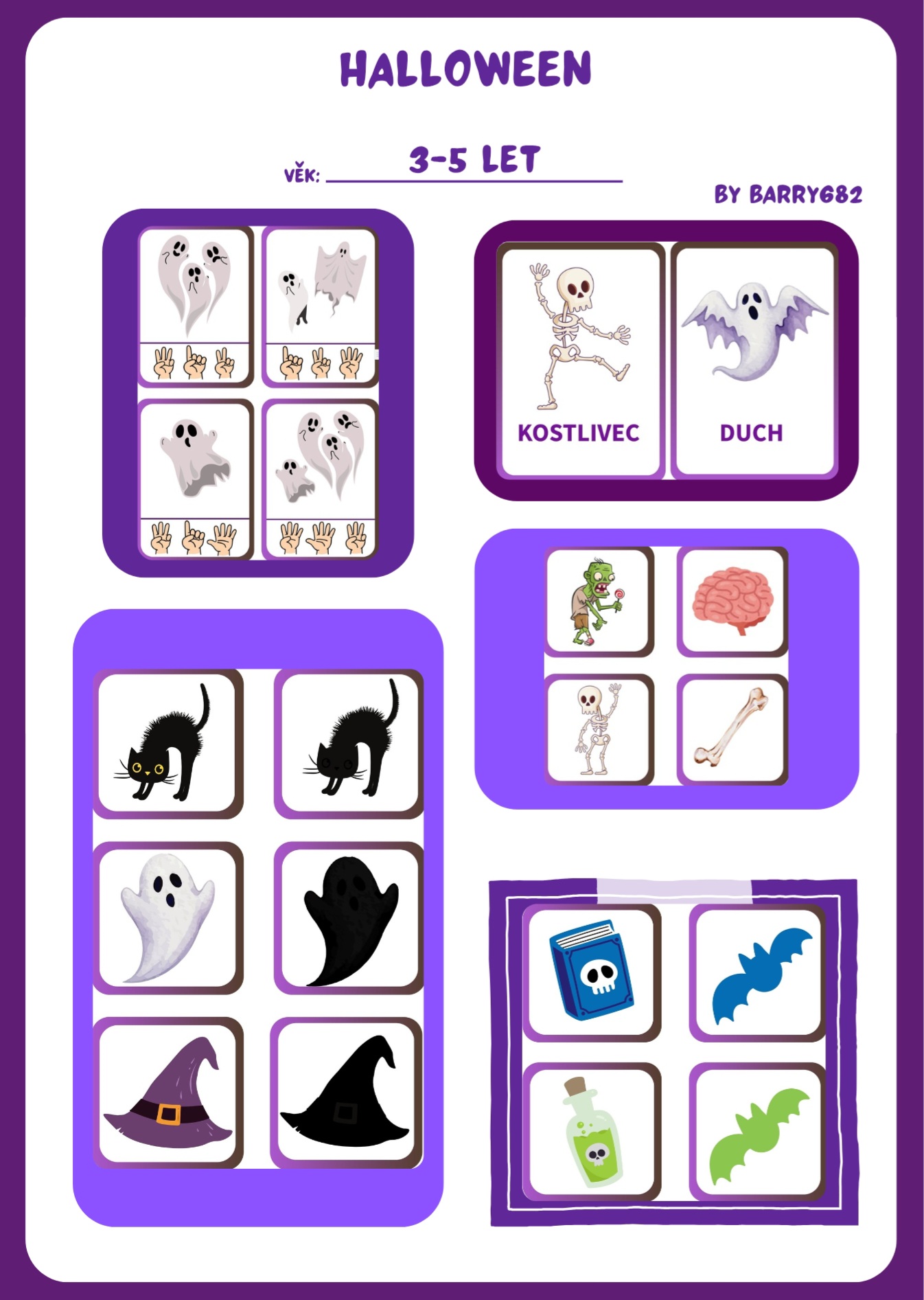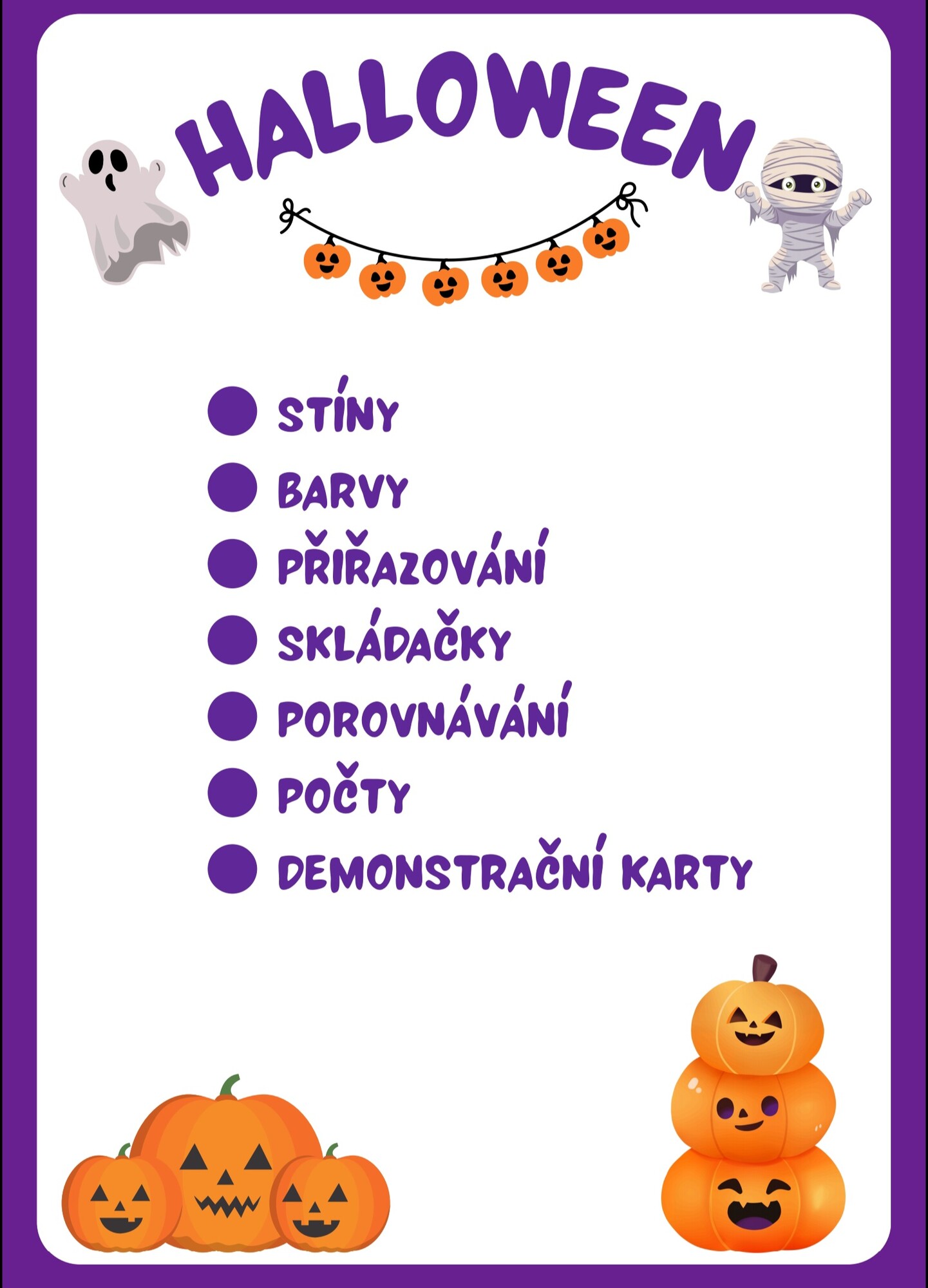 Ranní aktivity na stolečky na téma: Halloween Rozeznávání stínů a barevPřiřazování Skládačka Počty Větší/menší Demonstrační obrázky