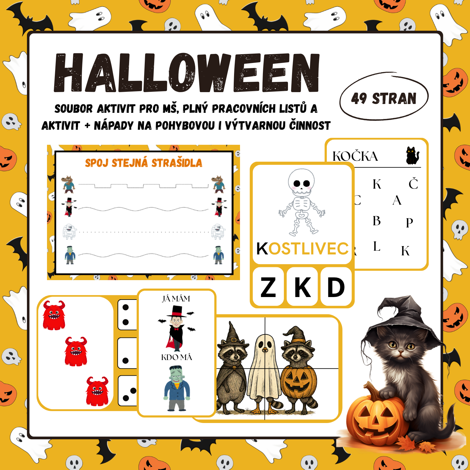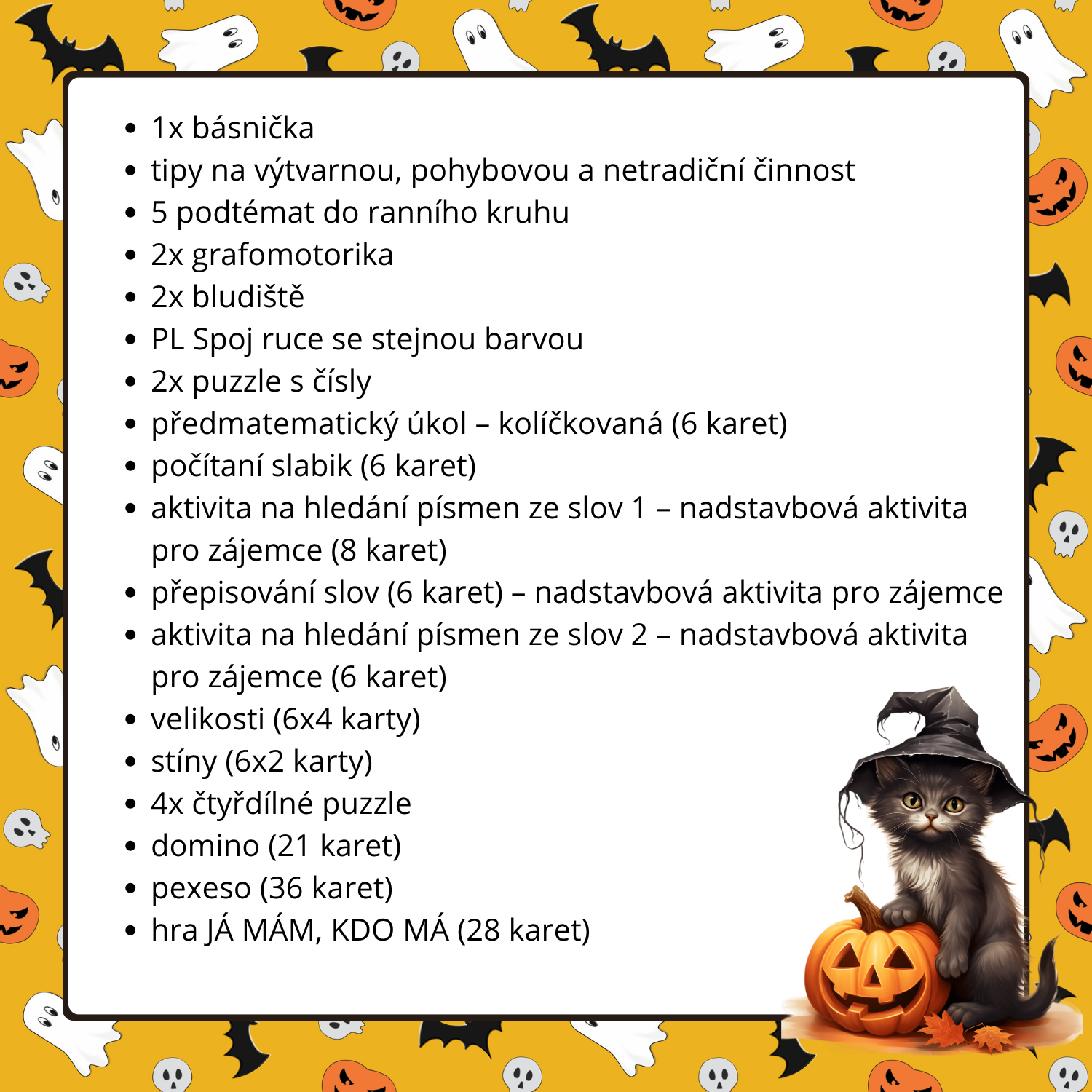 Materiál je zaměřen na téma halloween. Toto téma je dětem přiblíženo zejména pomocí pracovních listů a aktivit. Též v materiálu najdete nápady na výtvarnou či pohybovou činnost, podtémata do ranních kruhů a postřehovou pohádku.
