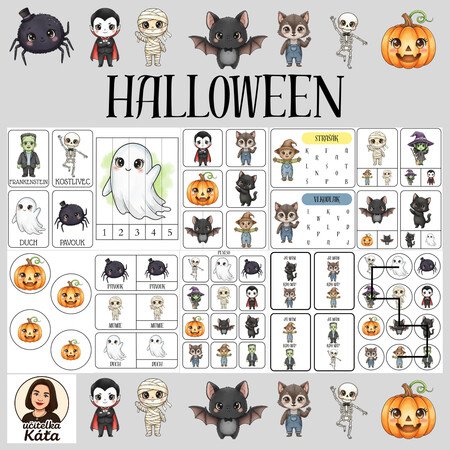 HALLOWEENSoubor obsahuje:Demonstrační obrázkyPůlené obrázkyKolíčkovanouSkládačky s číslyHledání písmenTřísložkové kartyŘazení podle velikostiPexesoJá mám, kdo má?Halloweenské bludiště