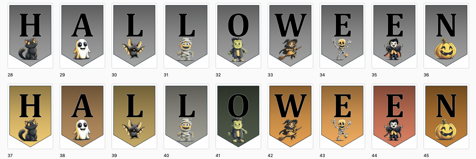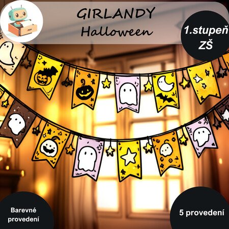 Tento halloweenský výzdobný materiál je určen pro 1. stupeň ZŠ. Obsahuje pět různých typů girland s nápisem HALLOWEEN, které se liší motivem i barevným laděním – od pavučin a dýní až po veselé příšerky a duchy.