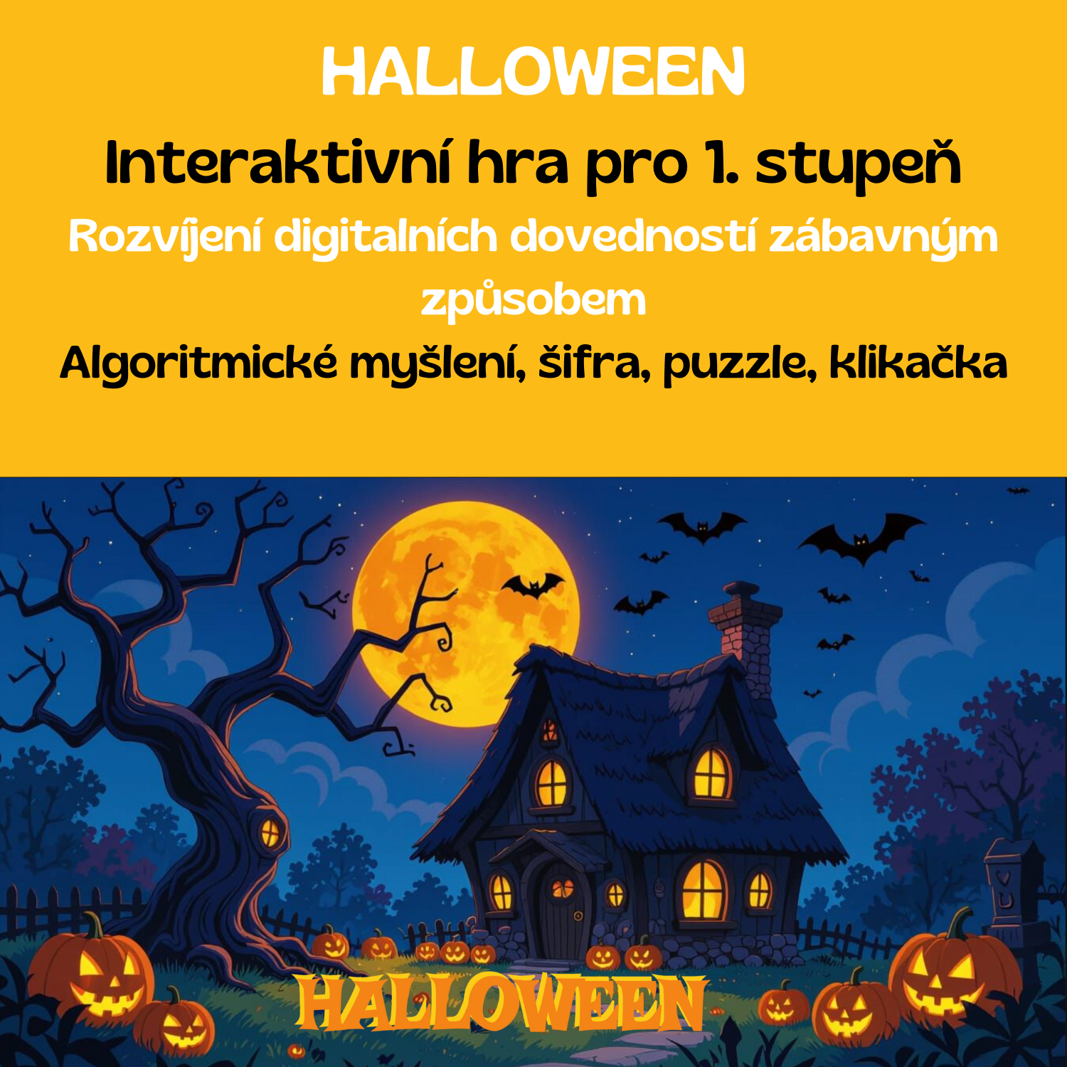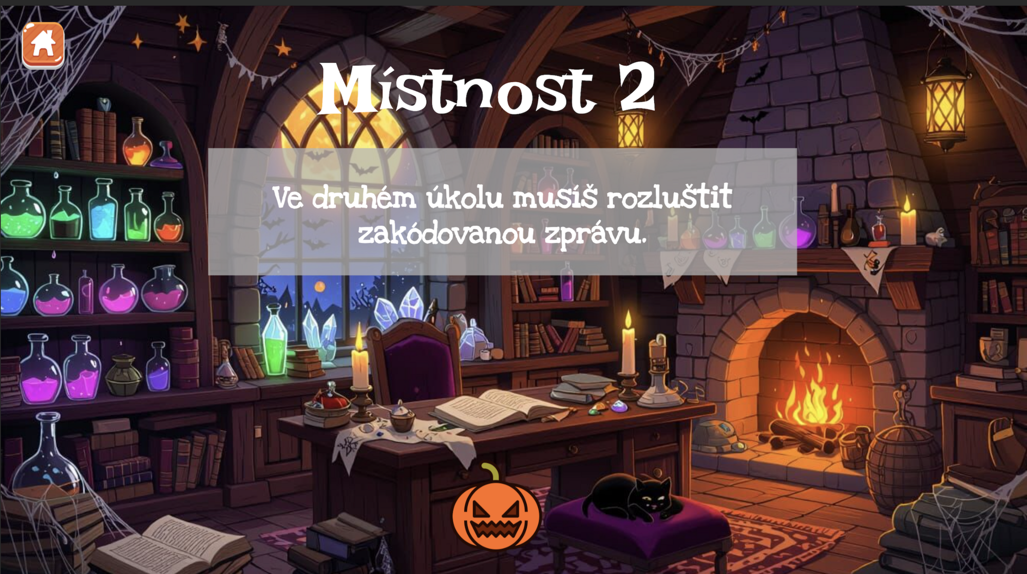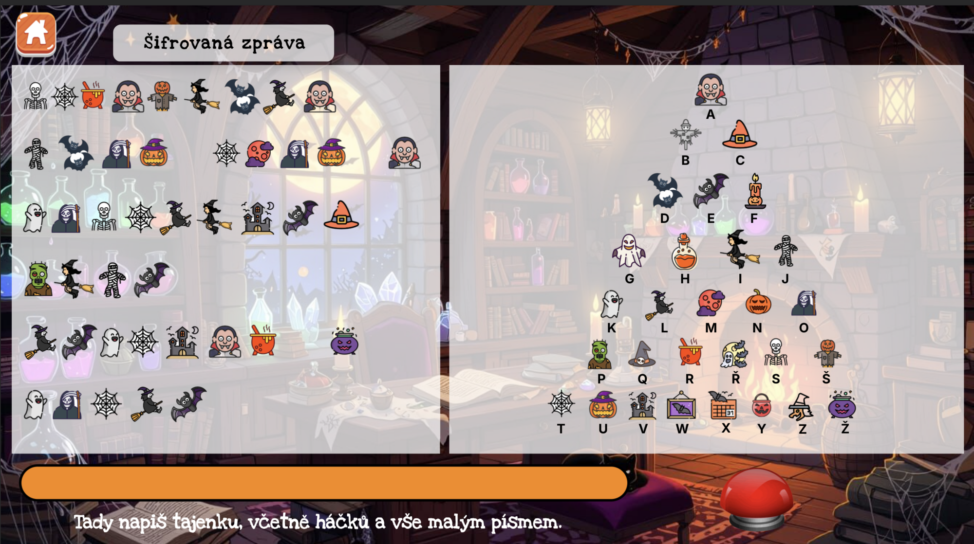 Halloweenské obrázky nahrazující písmena a děti luští zašifrovanou zprávu.