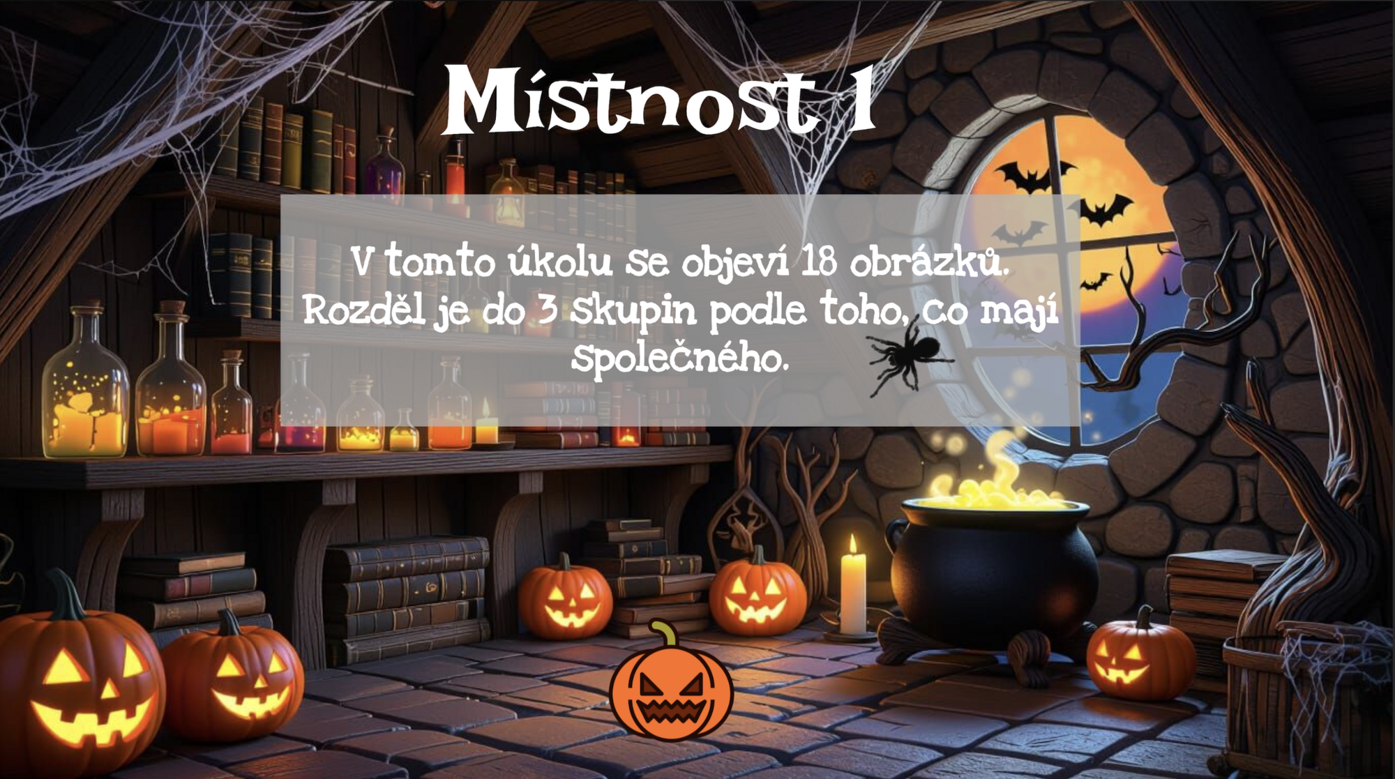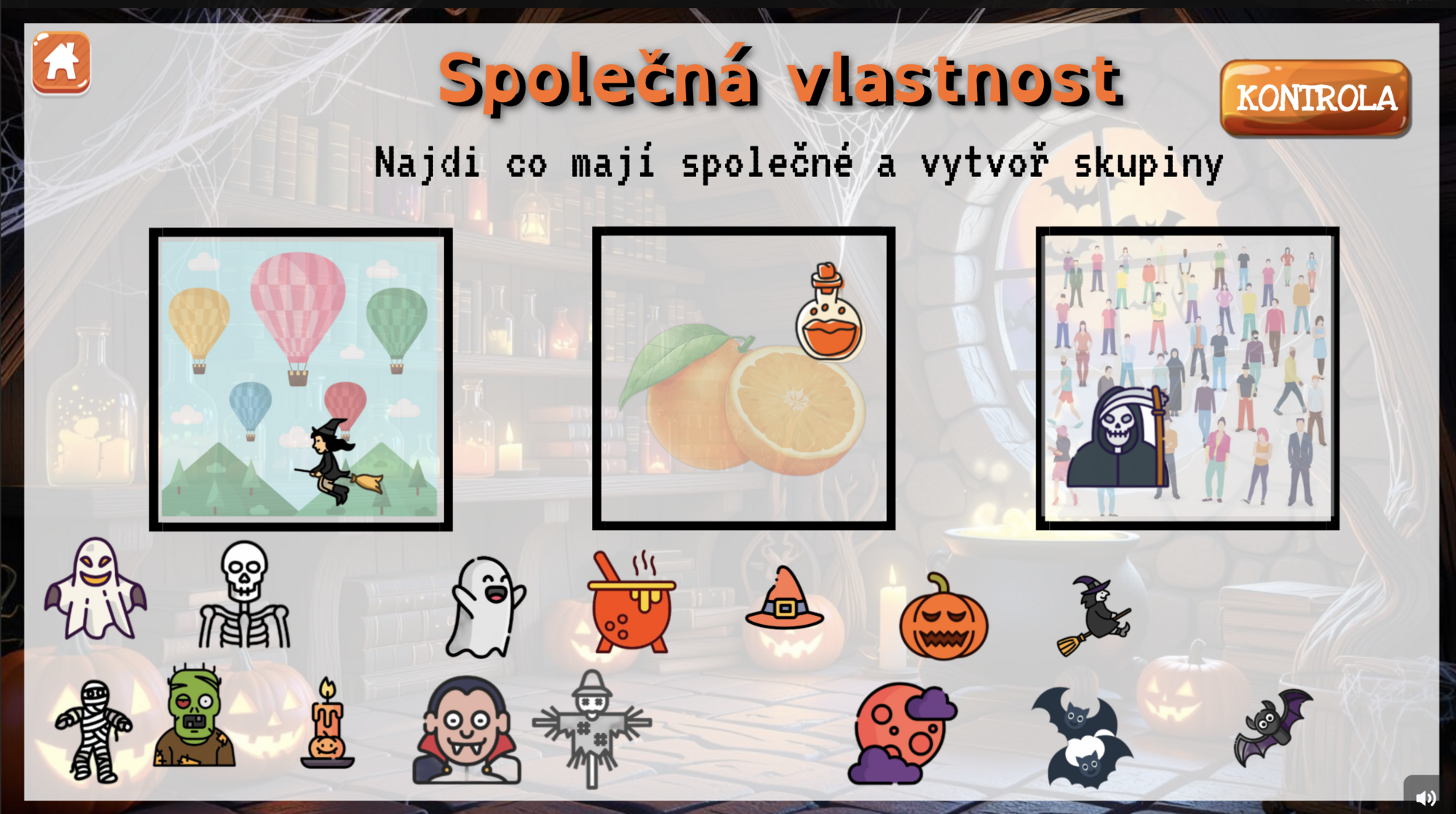 Děti musí rozdělit 18 obrázků podle společné vlastnosti. Špatně umístené obrázky se po kliknutí na Kontrola vrátí na původní místo.
