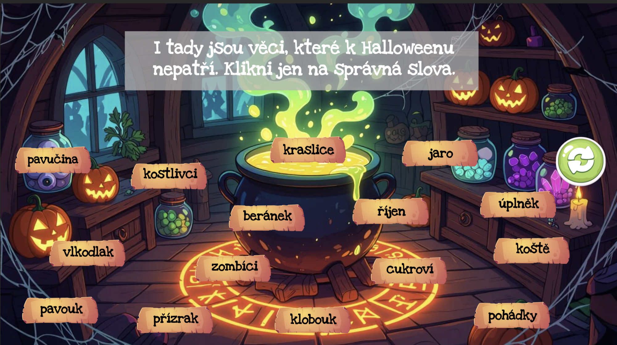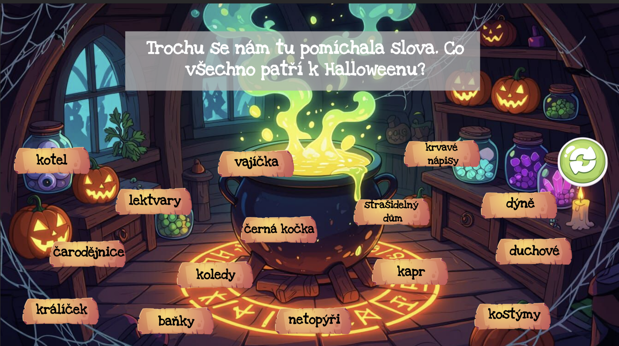 Dvě cvičení, v každém je 15 slov. 10 slov se vztahuje k Halloweenu a 5 buď k Vánocům nebo Velikonocím. Žák kliká na správná slova. Pokud chybuje, začíná od začátk a slova se přeskupí na jiné místo.