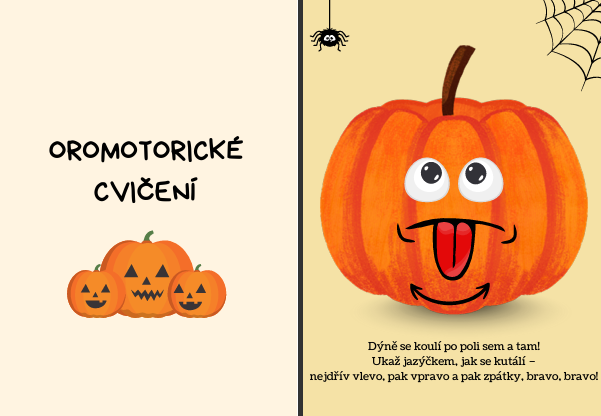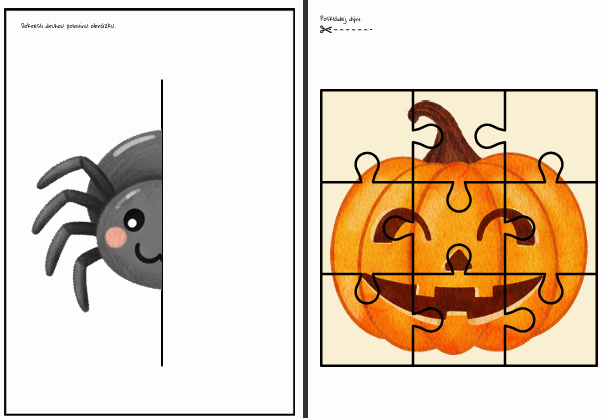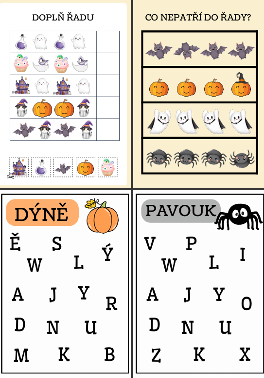 - Pracovní a herní listy: puzzle, doplňování řad, hledání písmen, logopedické listy, grafomotorika, dotváření obličejů dýní, srovnávání velikostí duchů, omalovánky.