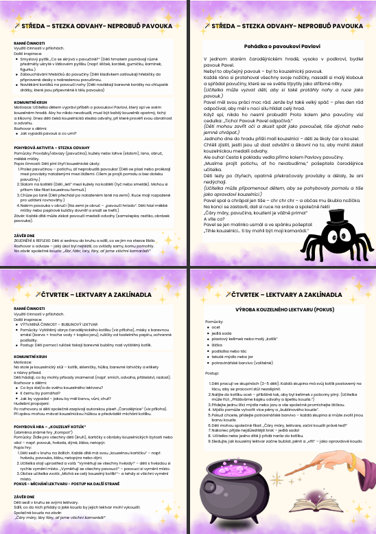 - Motivační pohádku „Pohádka o pavoukovi Pavlovi“ – autorský text s pohybovým zapojením dětí.