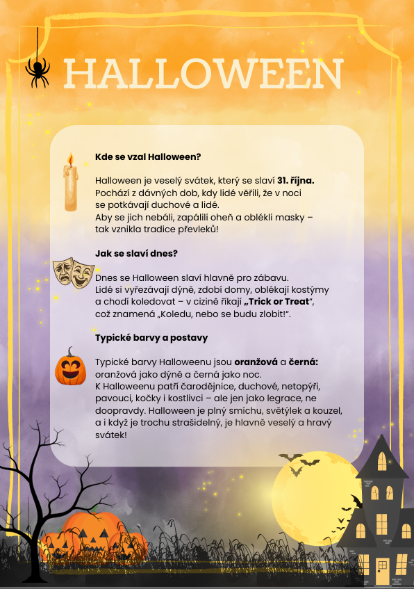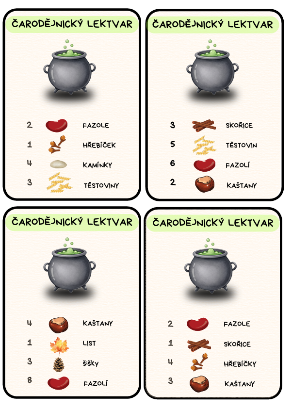 - Demonstrační kartičky: kouzelnické přísady, čarodějnická zaříkadla, symboly Halloweenu.