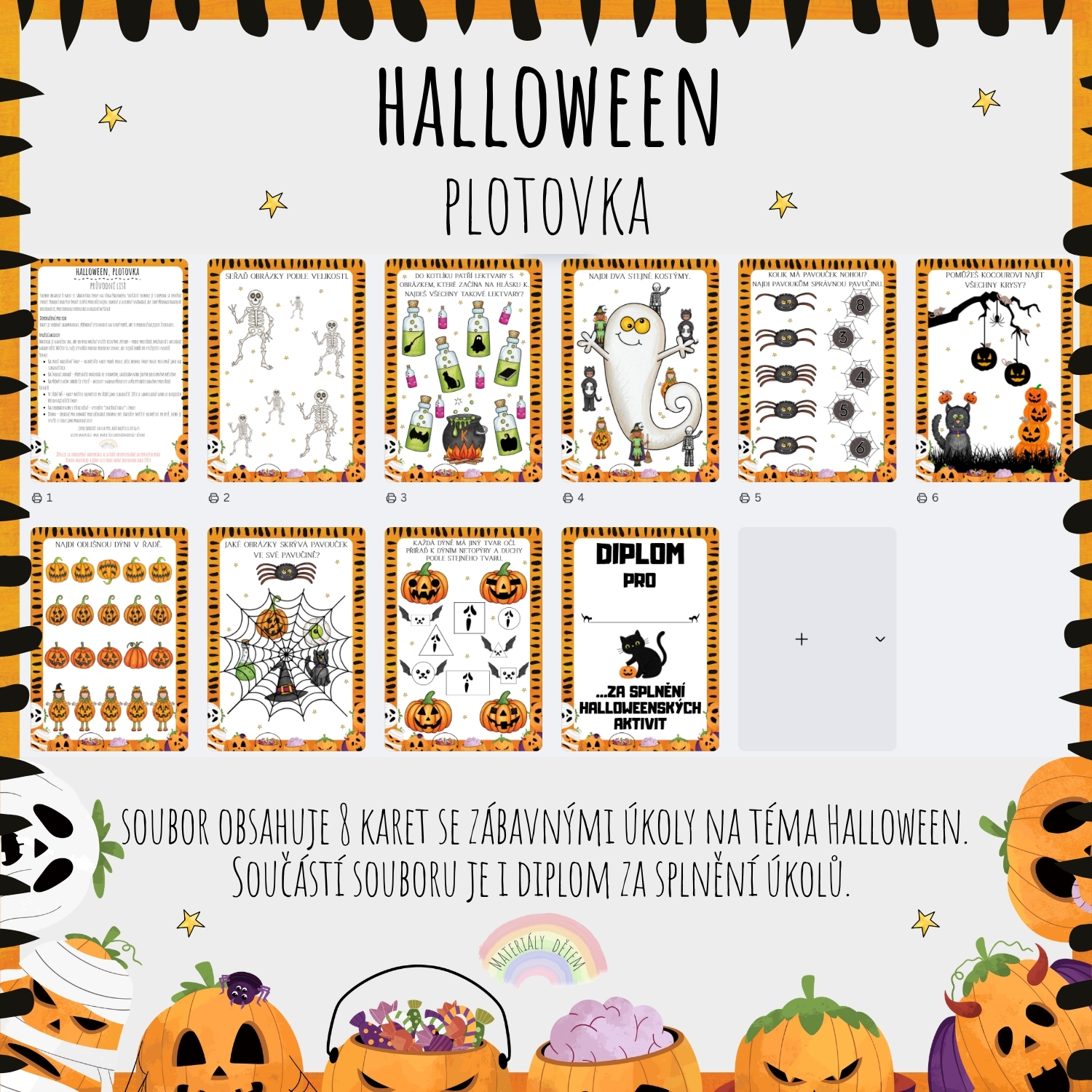 Soubor obsahuje 8 karet se zábavnými úkoly na téma Halloween. Součástí souboru je i diplom za splnění úkolů. Pomocí hravých úkolů si děti procvičí nejen zrakové a sluchové vnímání, ale také předmatematické dovednosti, prostorovou orientaci a logické myšlení.