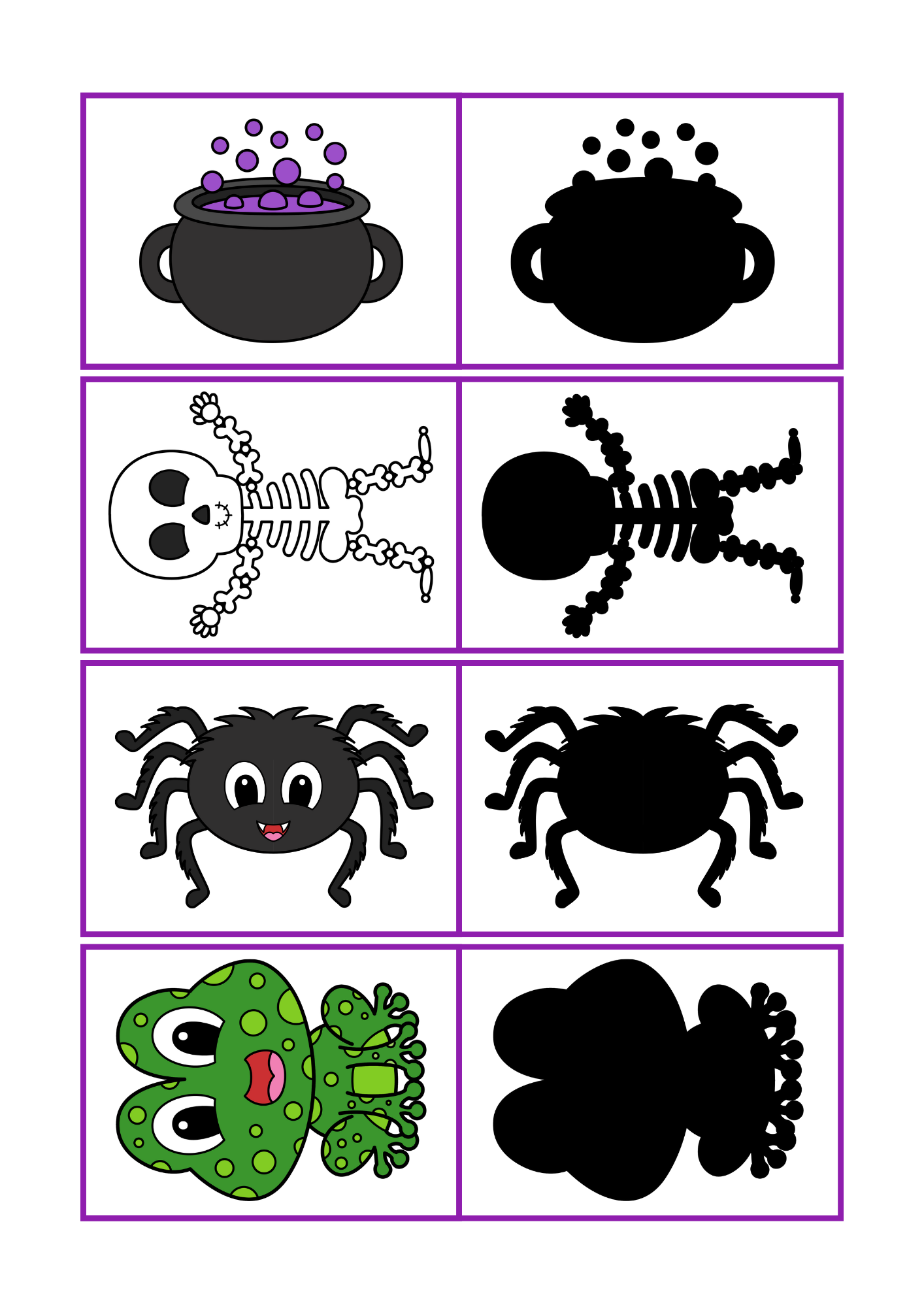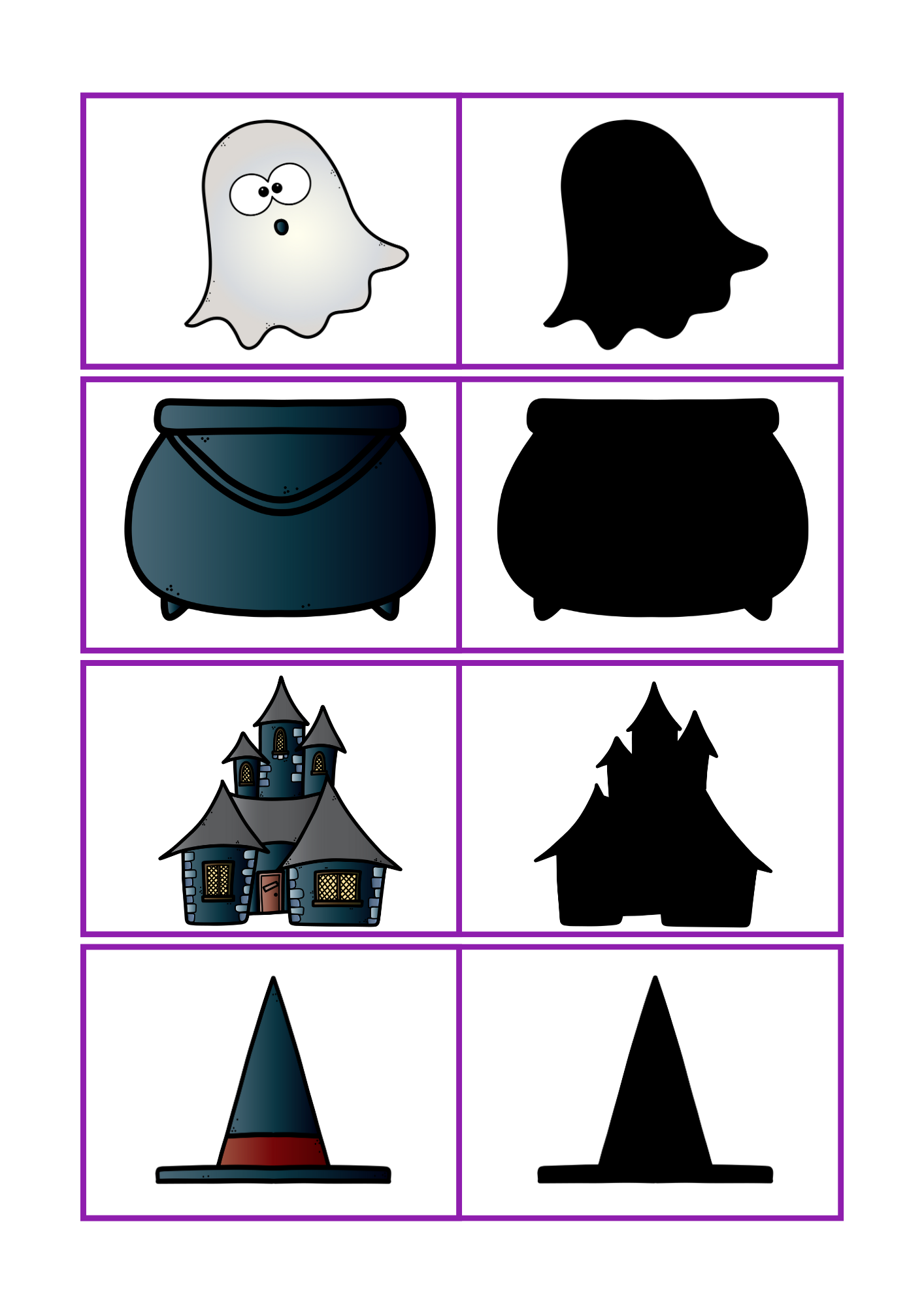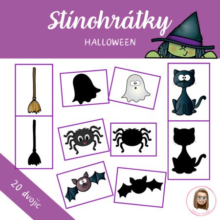 - tematické karty s obrázky a jejich stíny (Halloween motivy – dýně, netopýři, duchové aj.),