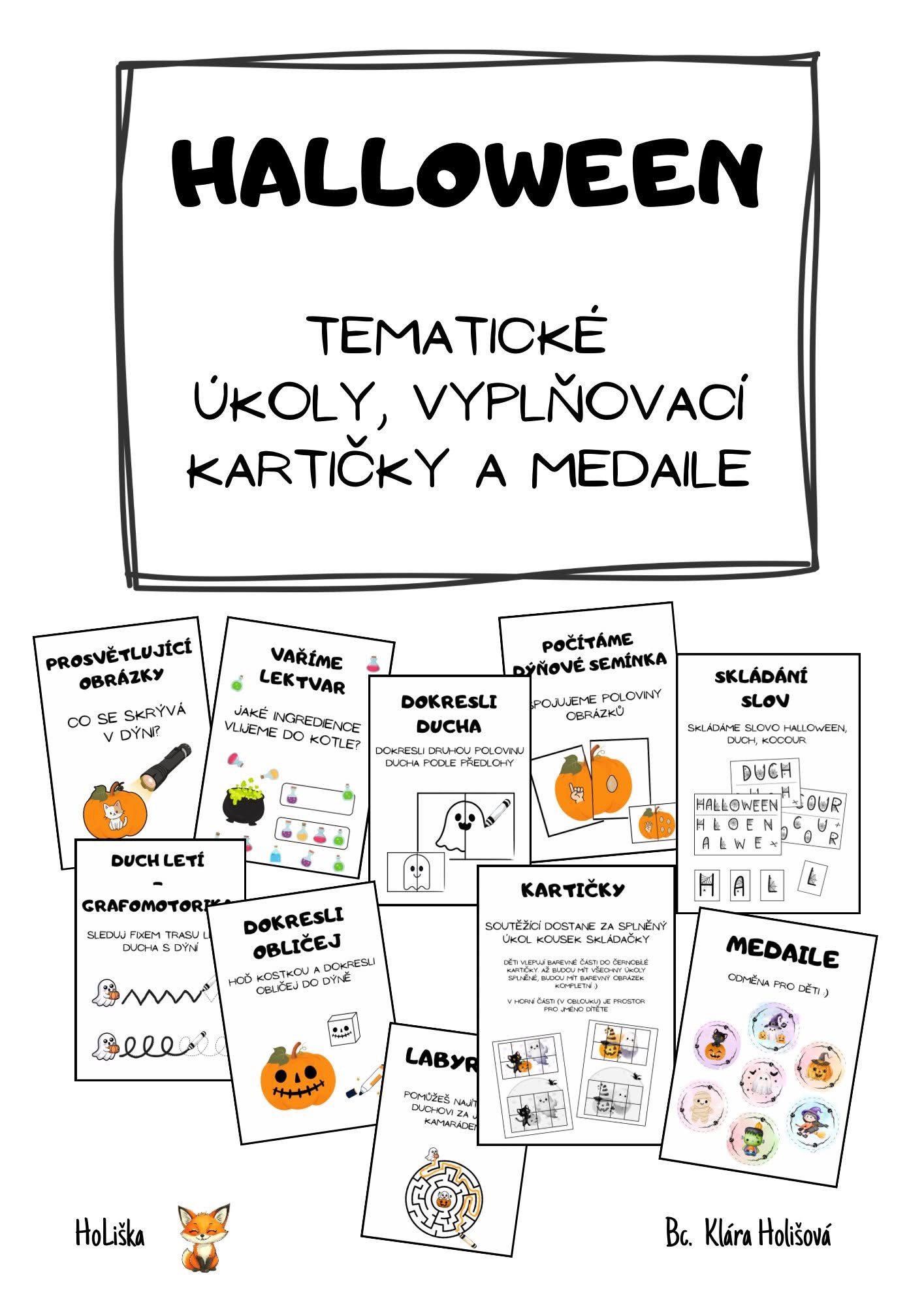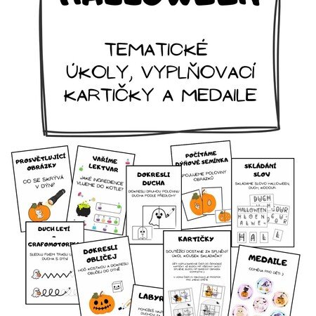 👻Kartičky: Černobílé obrázky slouží jako vyplňovací karty splněných úkolů. Na každém stanovišti děti získají dílek barevného obrázku a postupně skládají celý barevný obraz (8 dílků). Obrázek má také prostor pro jméno dítěte nebo název soutěžní skupinky dětí.