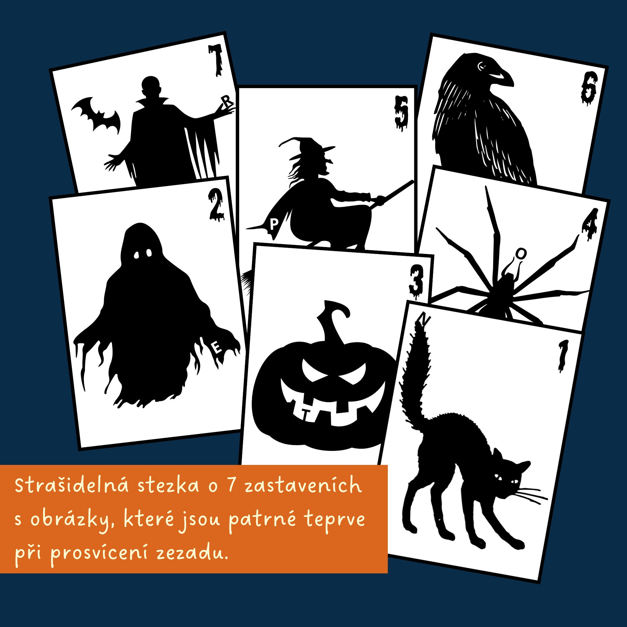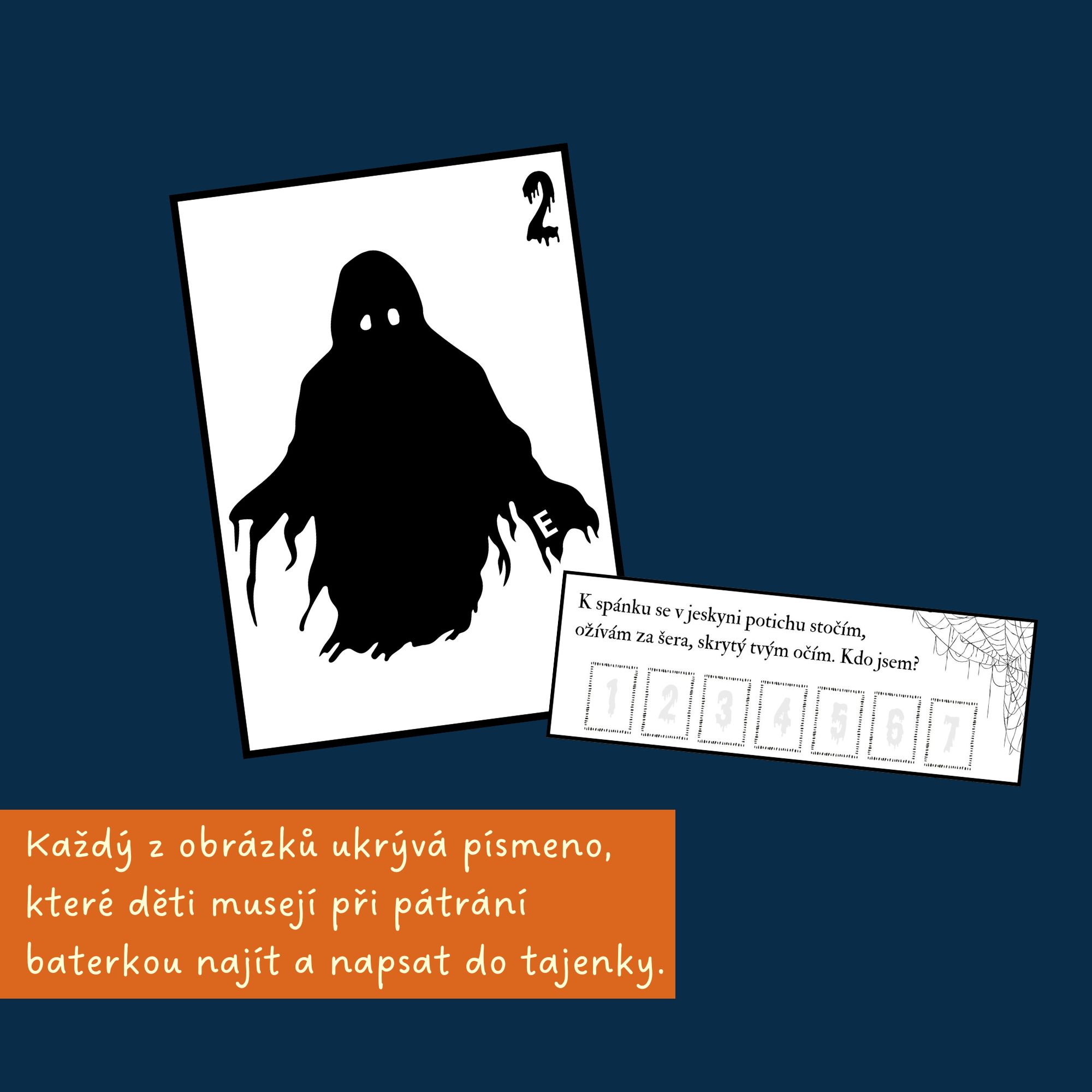 🕷Úkolem dětí je projít za tmy danou trasu a hledat po cestě strašidelné obrázky. Obrázky jsou ale skryté - aby byly vidět, je nutné papír zezadu prosvítit baterkou. V každém z obrázků je schované písmenko, které je nutné umístit do tabulky. 7 písmenek poskládaných dohromady vytvoří tajenku: NETOPÝR.
