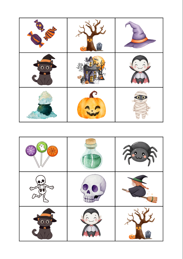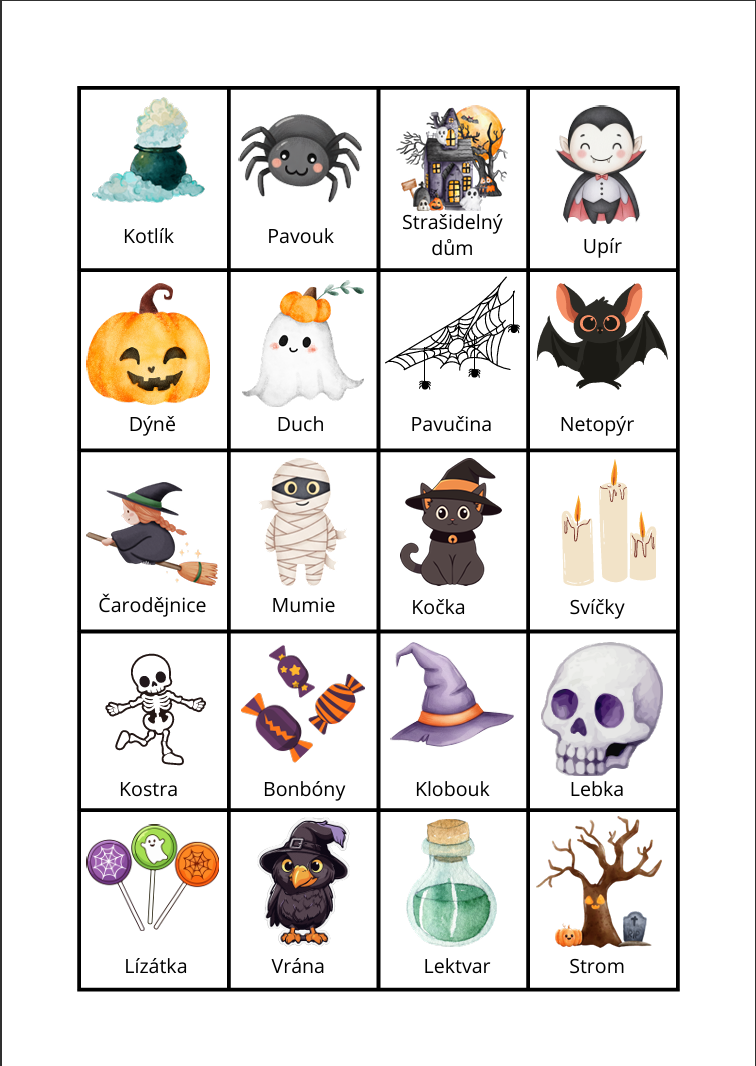 Soubor obsahuje 13 stran A4, 20 hracích karet a seznam obrázků ke hře na téma Halloween.