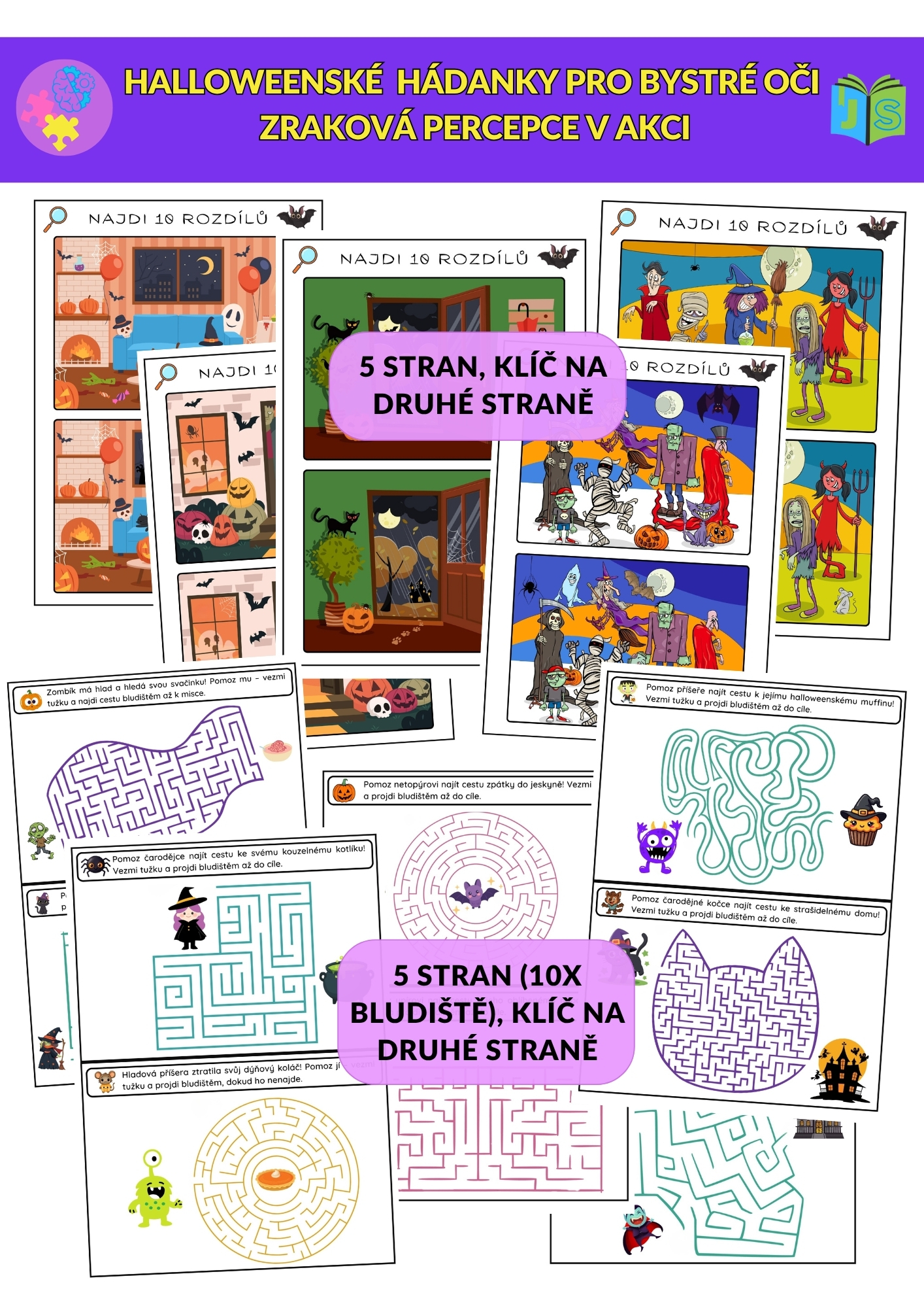Zábavný soubor 40 stran aktivit na rozvoj zrakového vnímání, pozornosti a jemné motoriky. Děti hledají chybějící dílky v obrázcích, procházejí strašidelná bludiště a porovnávají dvojice ilustrací, aby objevily rozdíly.