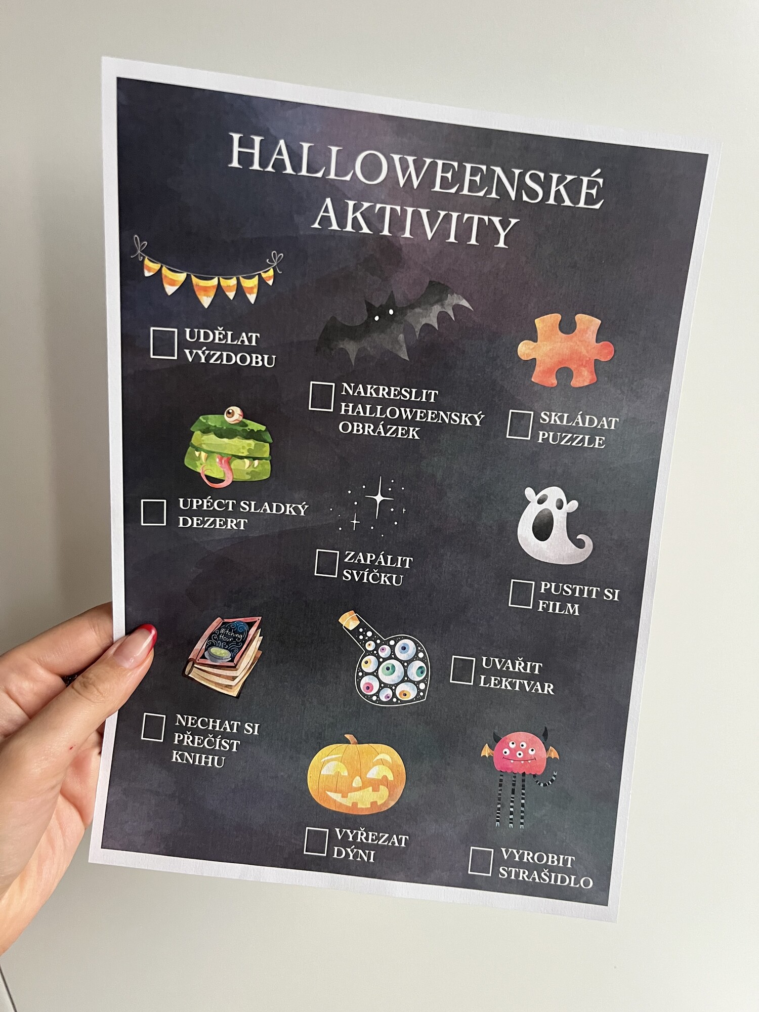 V souboru dále můžete najít plakát s halloweenskými aktivitami, který můžete vytisknout a dát například na nástěnku pro inspiraci rodičů nebo na tabuli ve třídě (s dětmi pak lze aktivity po splnění odškrtávat).