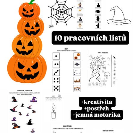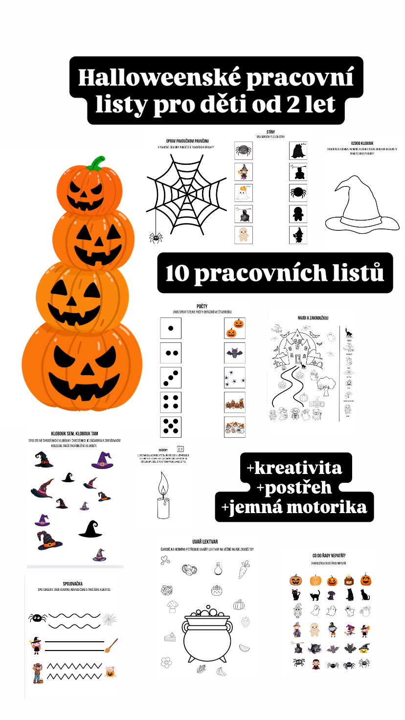Připravila jsem sadu 10 zábavných pracovních listů určených pro děti ve věku 2–6 let. Díky jednoduchým a hravým úkolům se skvěle hodí nejen do mateřských škol, ale i jako oddechová aktivita do školní družiny nebo doplněk k výuce o Halloweenu.