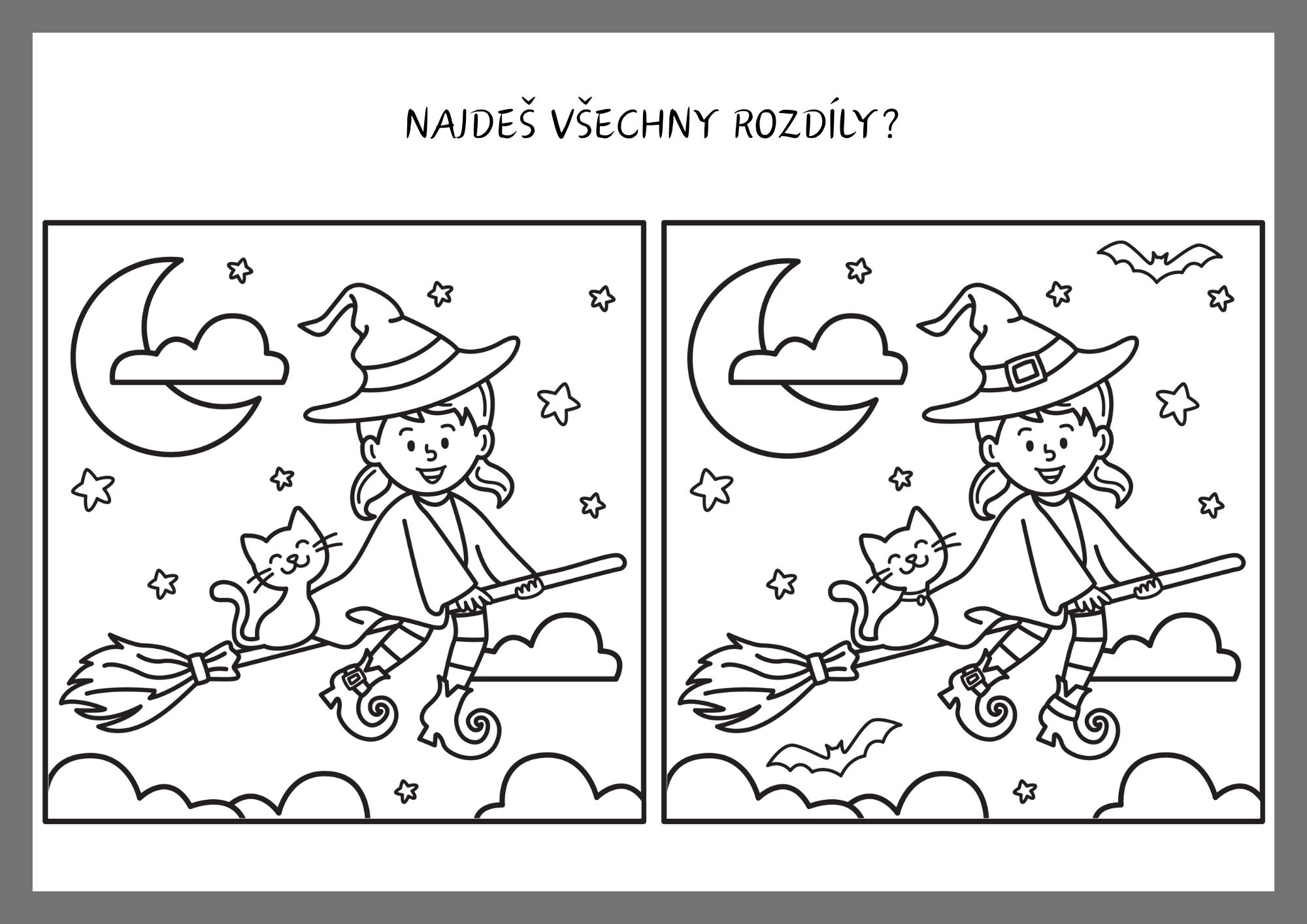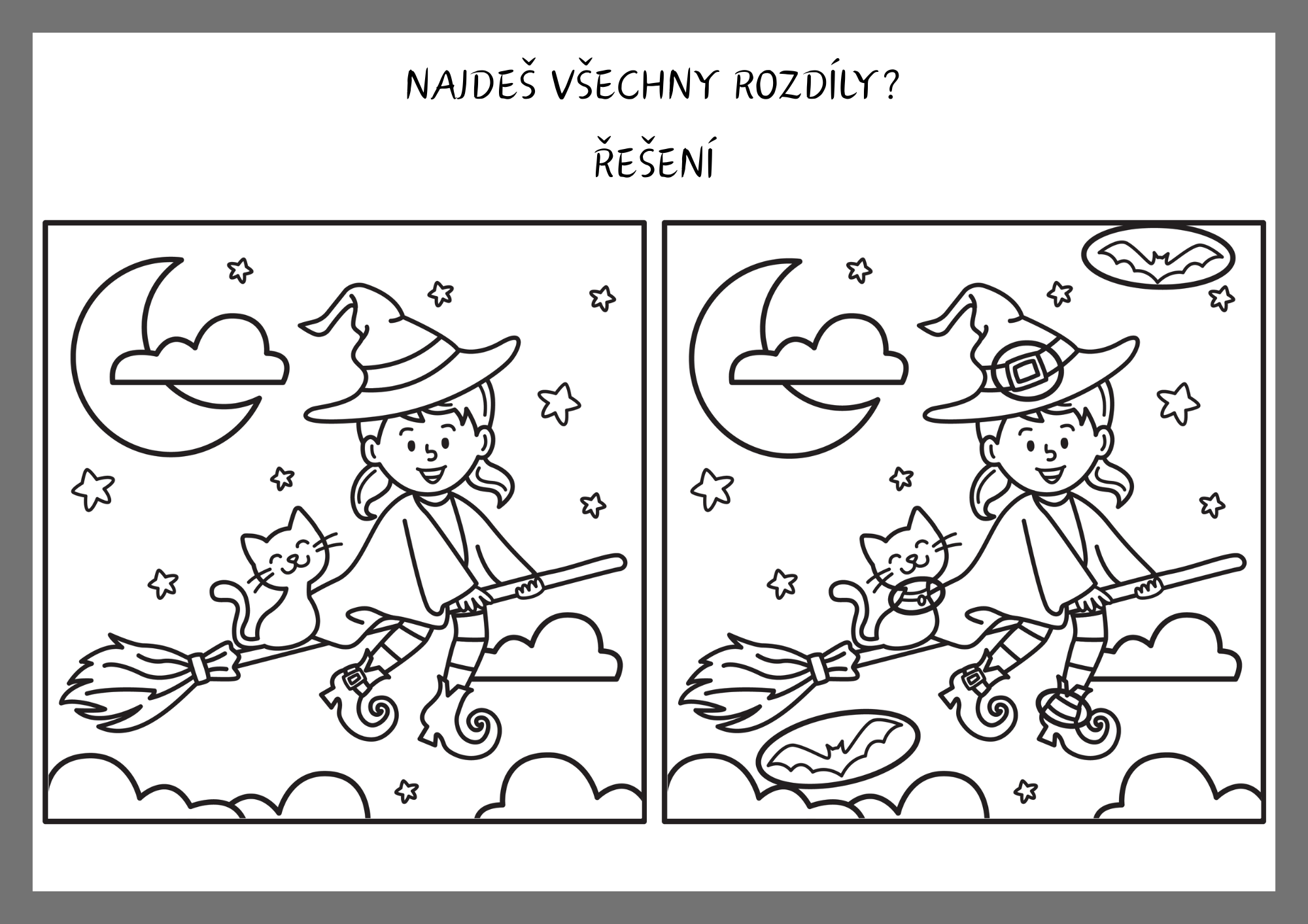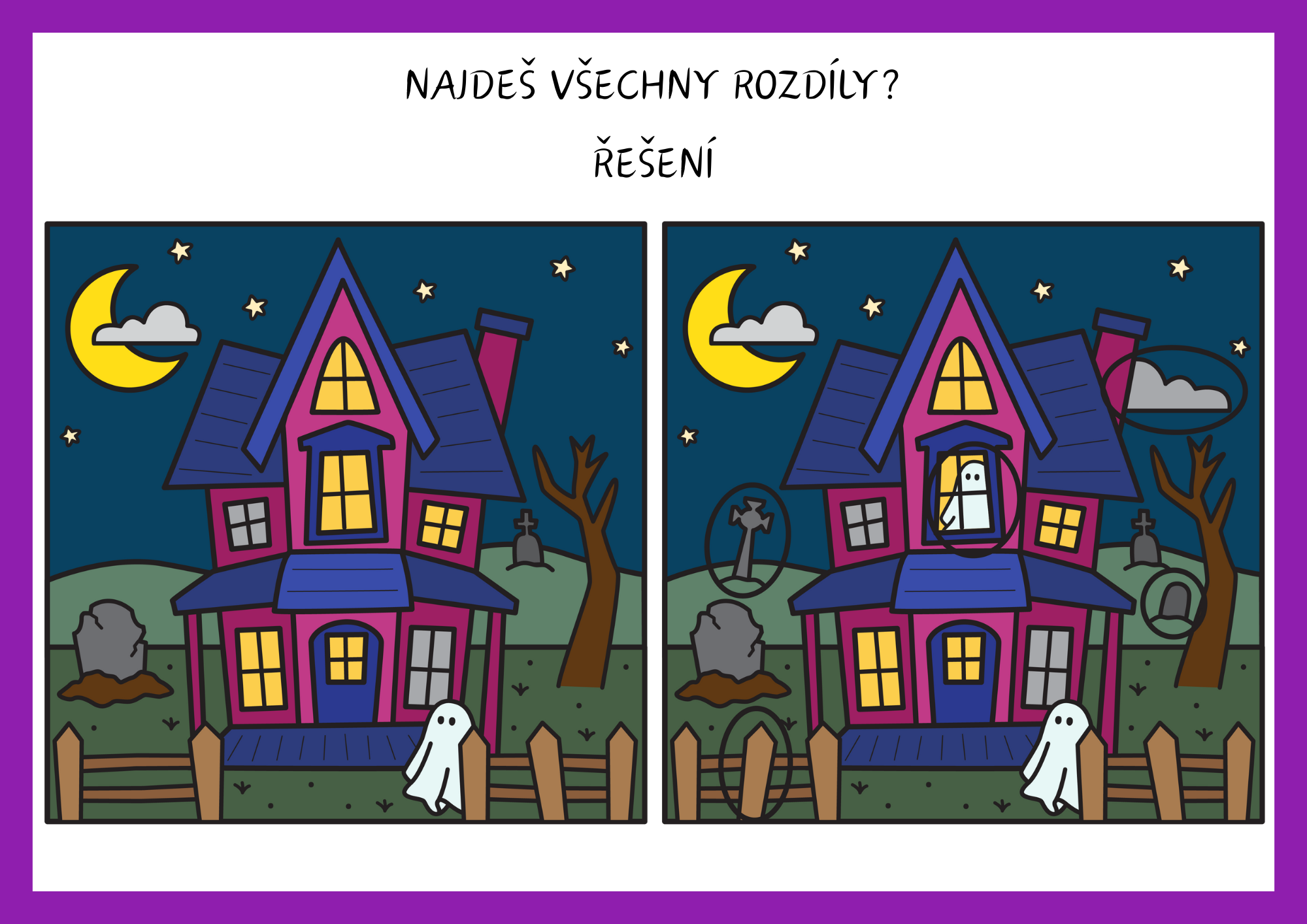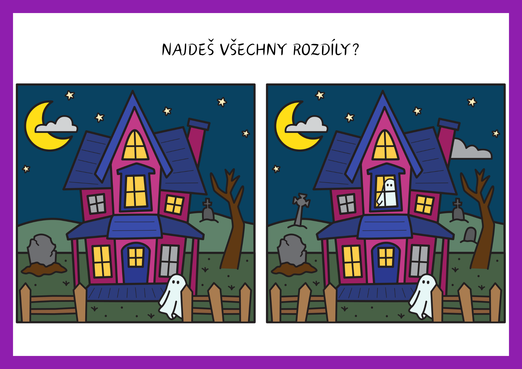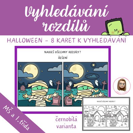 - 8 barevných karet s halloweenskými motivy k vyhledávání rozdílů,
