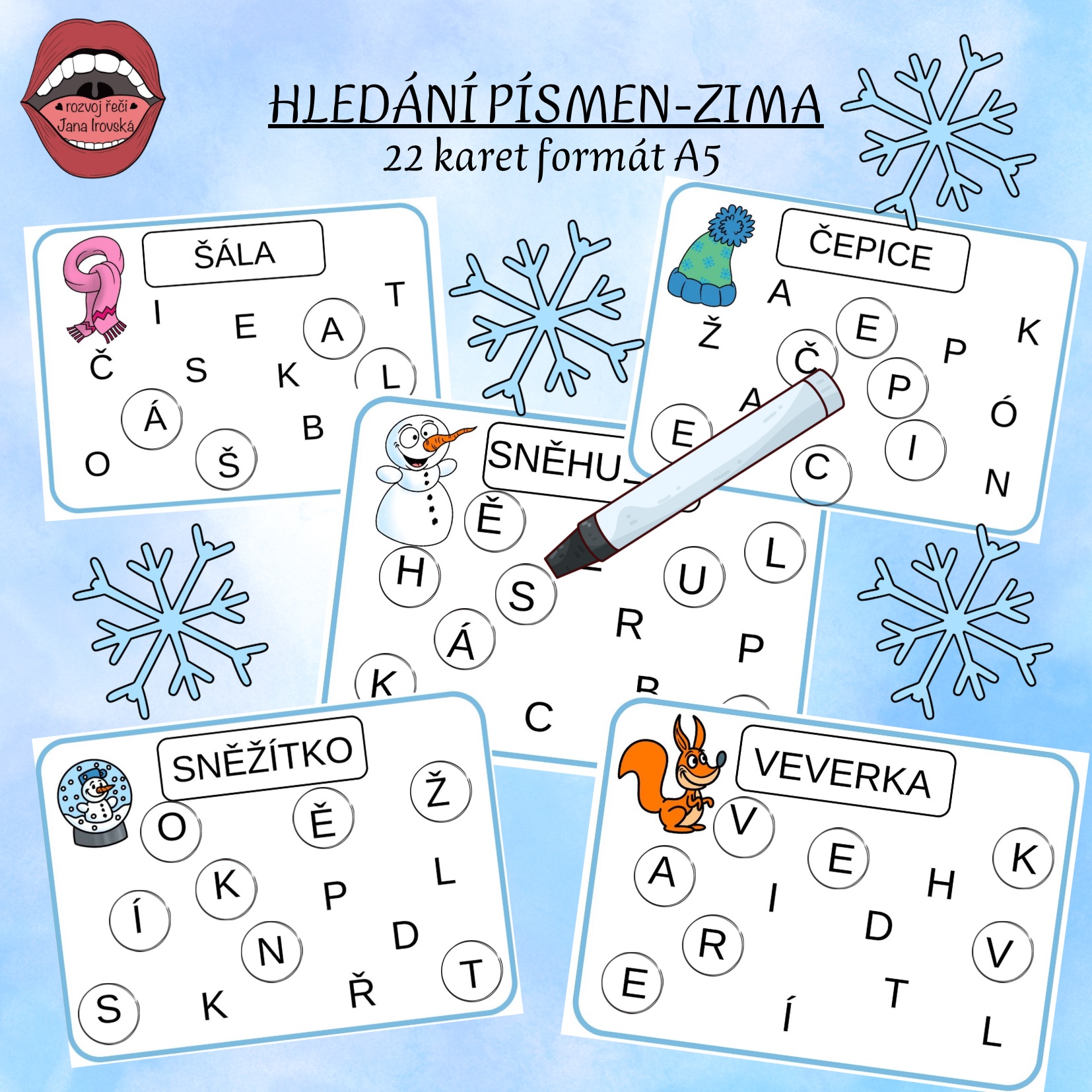 Soubor obsahuje 22 karet se zimními obrázky a jejich názvy. Děti mají za úkol zakroužkovat smazací fixou písmena tak, aby z nich vzniklo dané slovo.