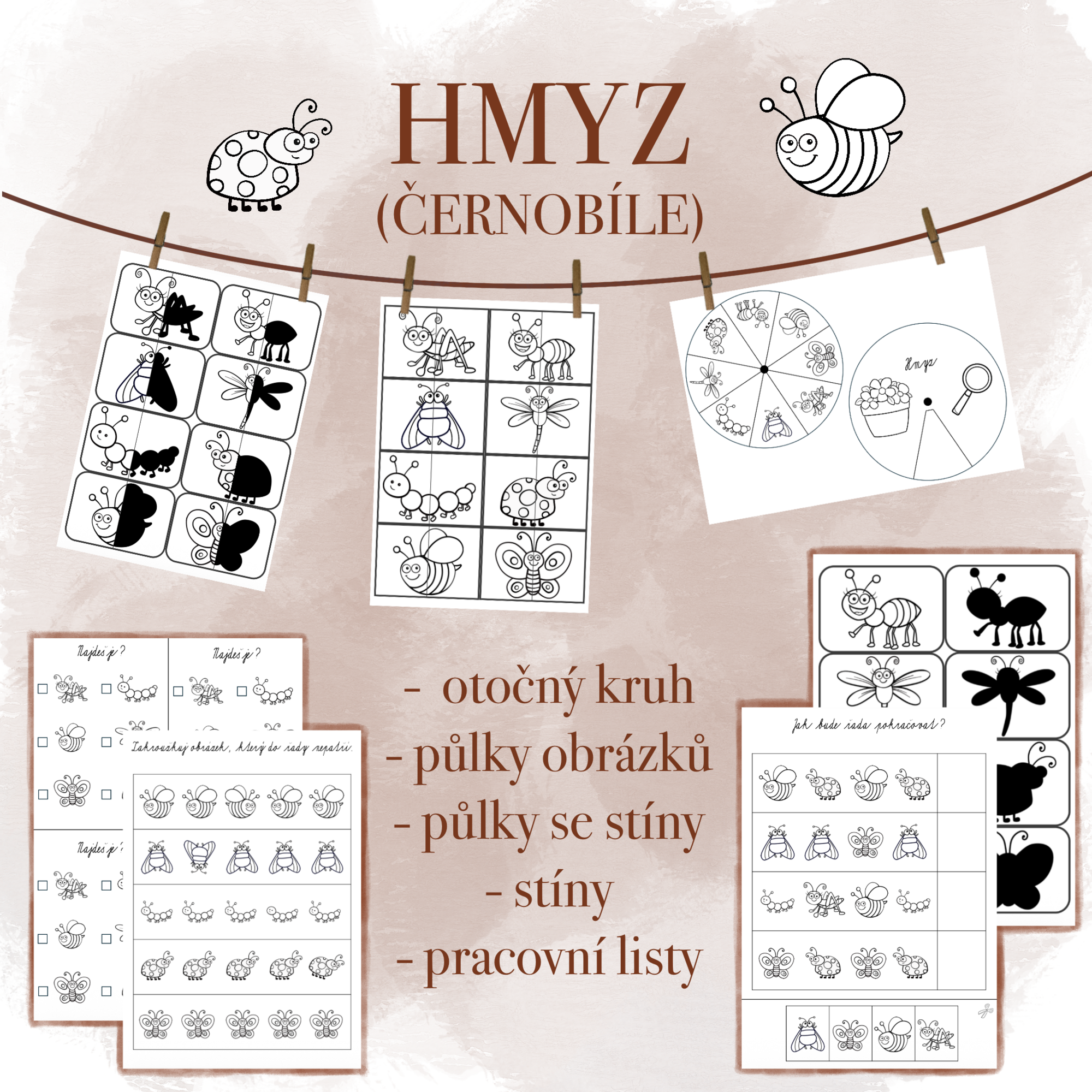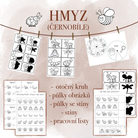 Tento soubor obsahuje černobílé hmyzí aktivity. Najdete zde otočný kruh, půlky obrázků, stíny, půlky obrázků se stíny a pracovní listy.