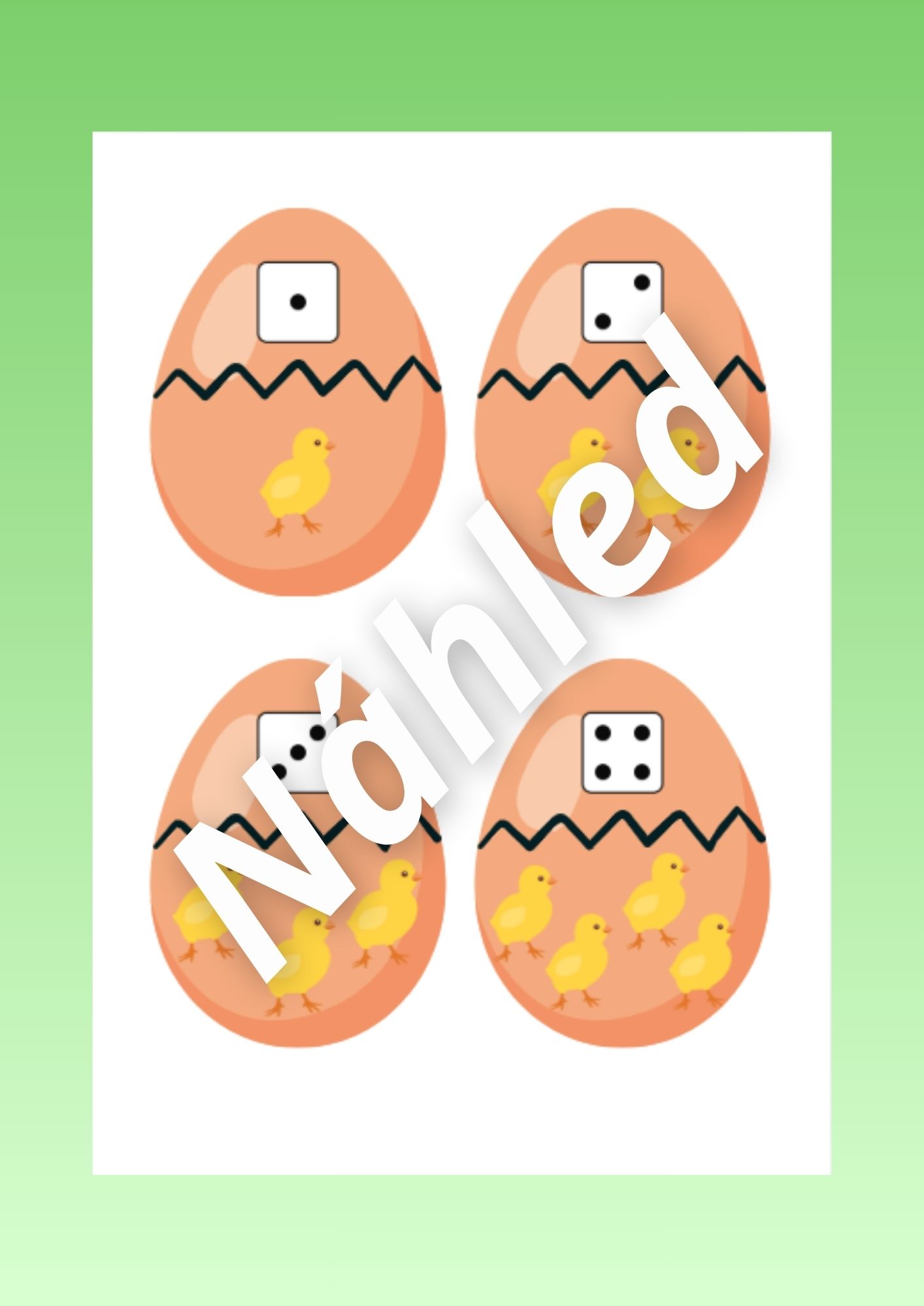 - Vejce - počty (str. 12-14) - rozstříháme vajíčka a děti poté hledají shodný počet puntíků a kuřátek