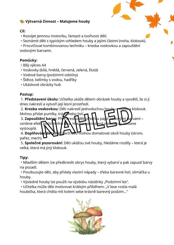 Tento podzimní tematický týden přináší dětem radost z objevování přírody, poznávání hub, tvoření i pohybu. Soubor nabízí pestrou paletu aktivit, které propojují poznávání, hru a fantazii.