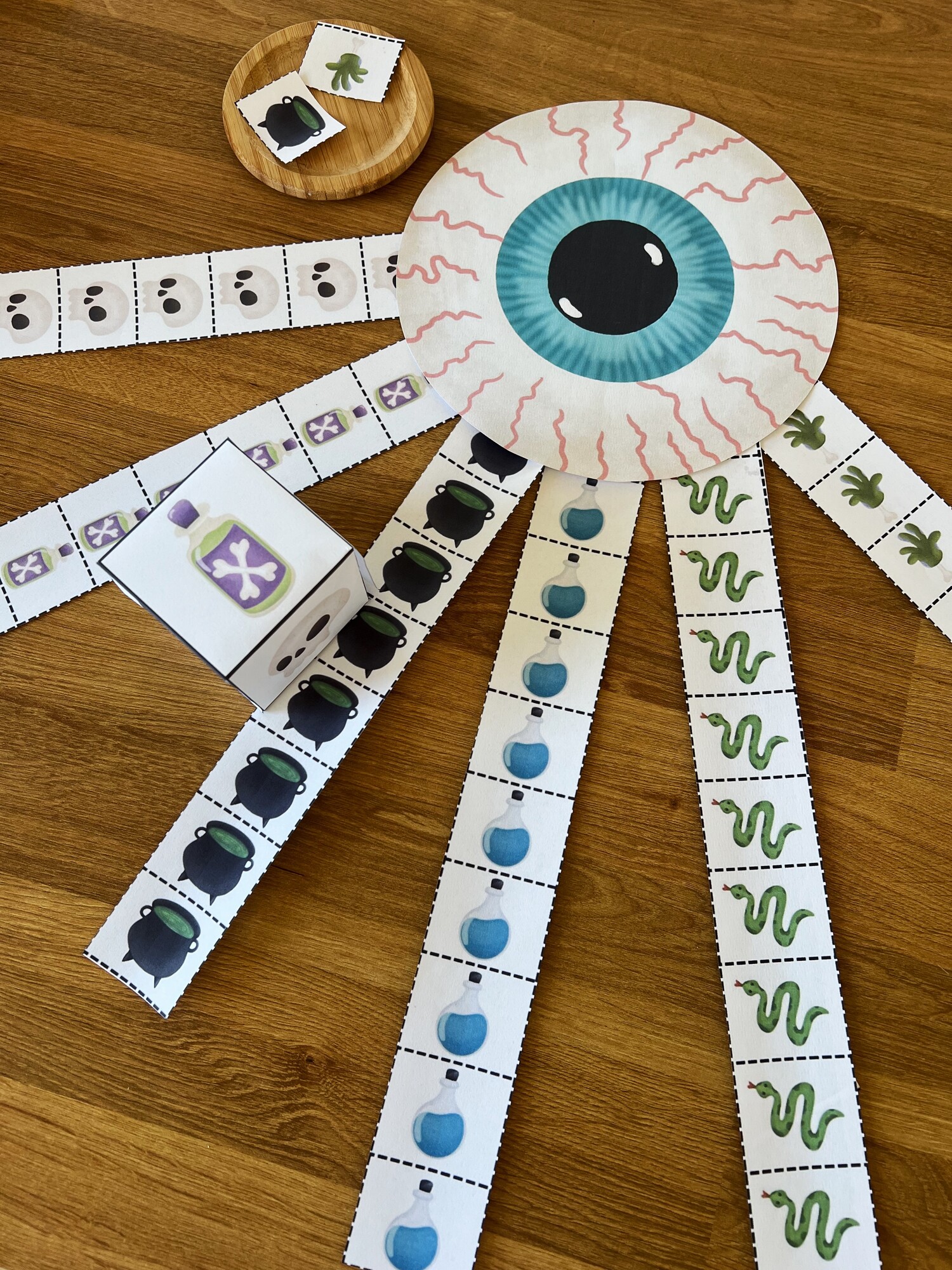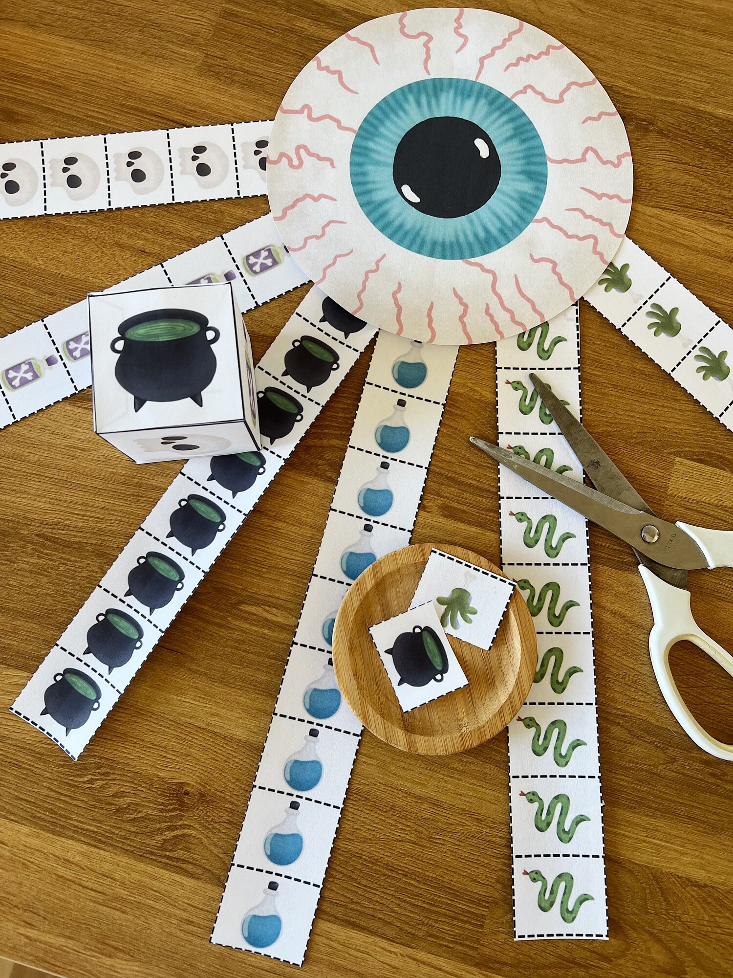 Děti hází hrací kostkou a následně si ustřihnou obrázek, který jim padl. Vítězí ten, kdo od určitého obrázku nasbírá nejvíce kusů.