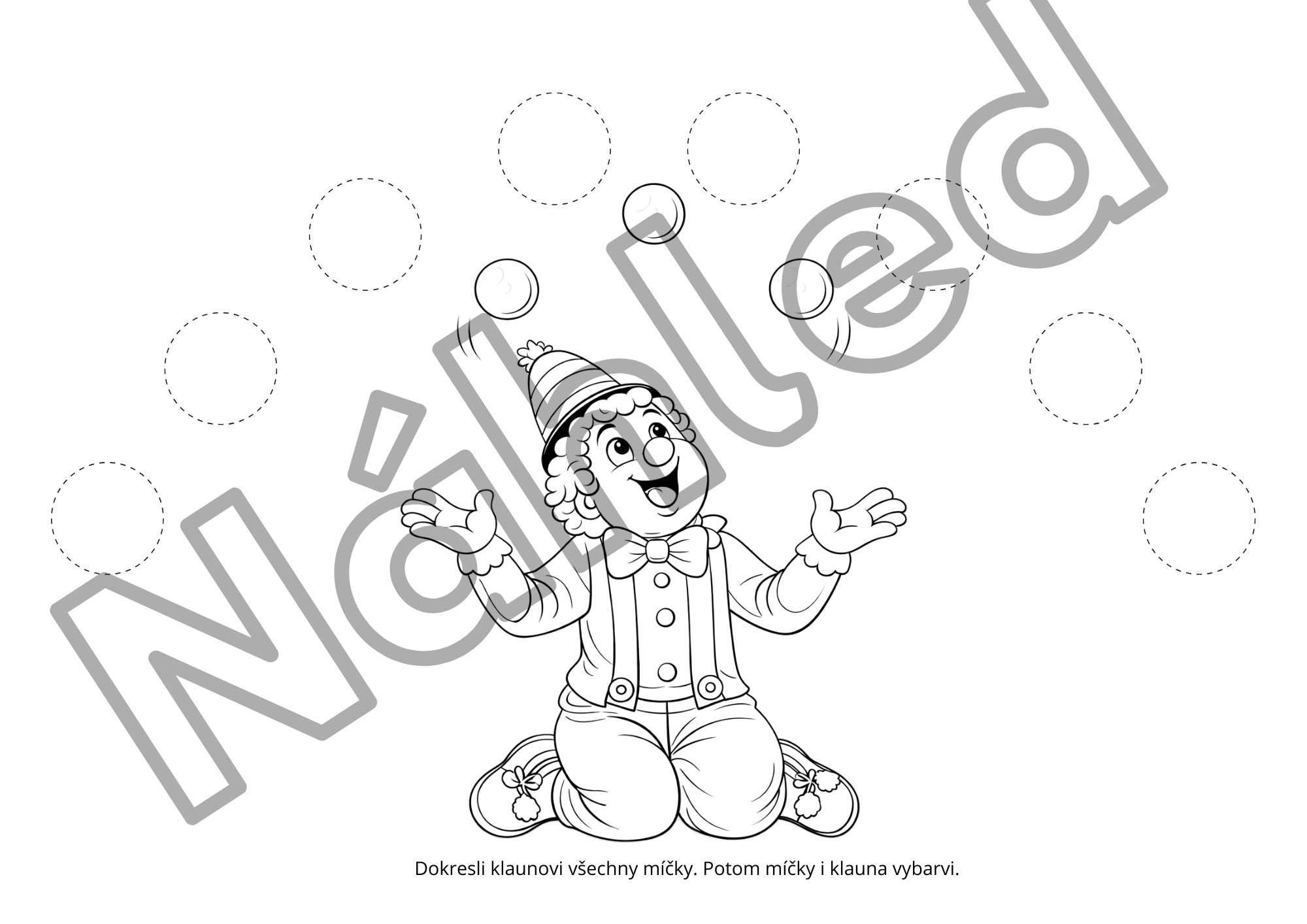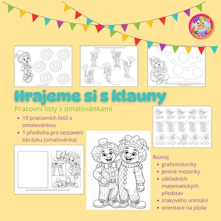Soubor obsahuje 10 tematických pracovních listů s omalovánkami klaunů + 1 předloha (omalovánka) ke skládačce, jsou určeny pro rozvoj grafomotoriky, jemné motoriky, základních matematických představ, zrakového vnímání a orientace na ploše a jsou vhodné pro děti předškolního věku. Každý pracovní list obsahuje zadání úkolu.