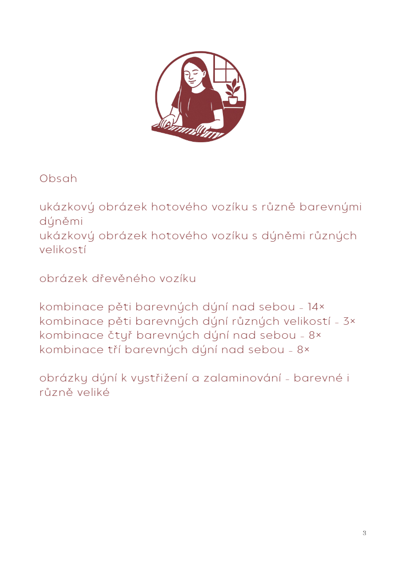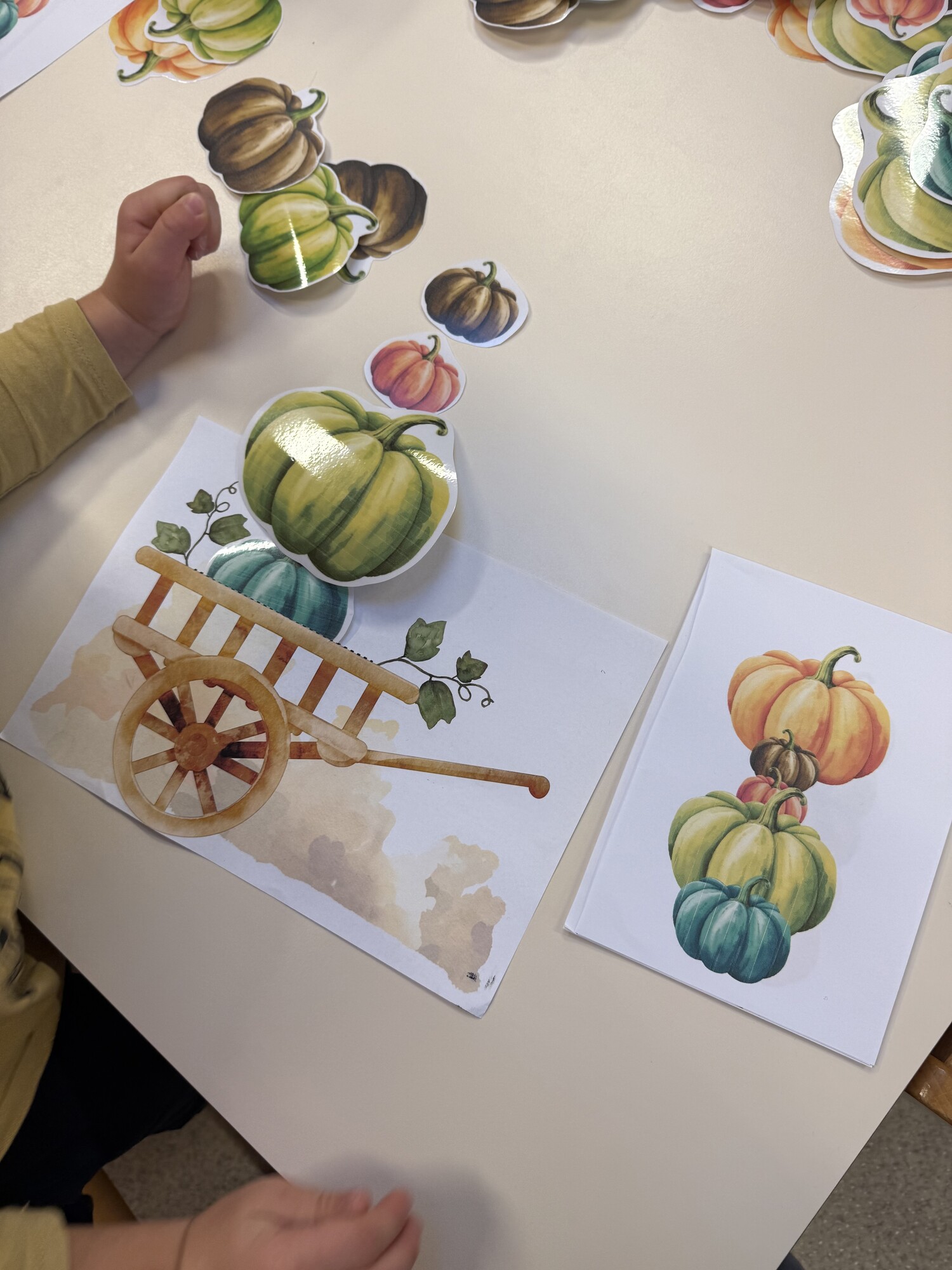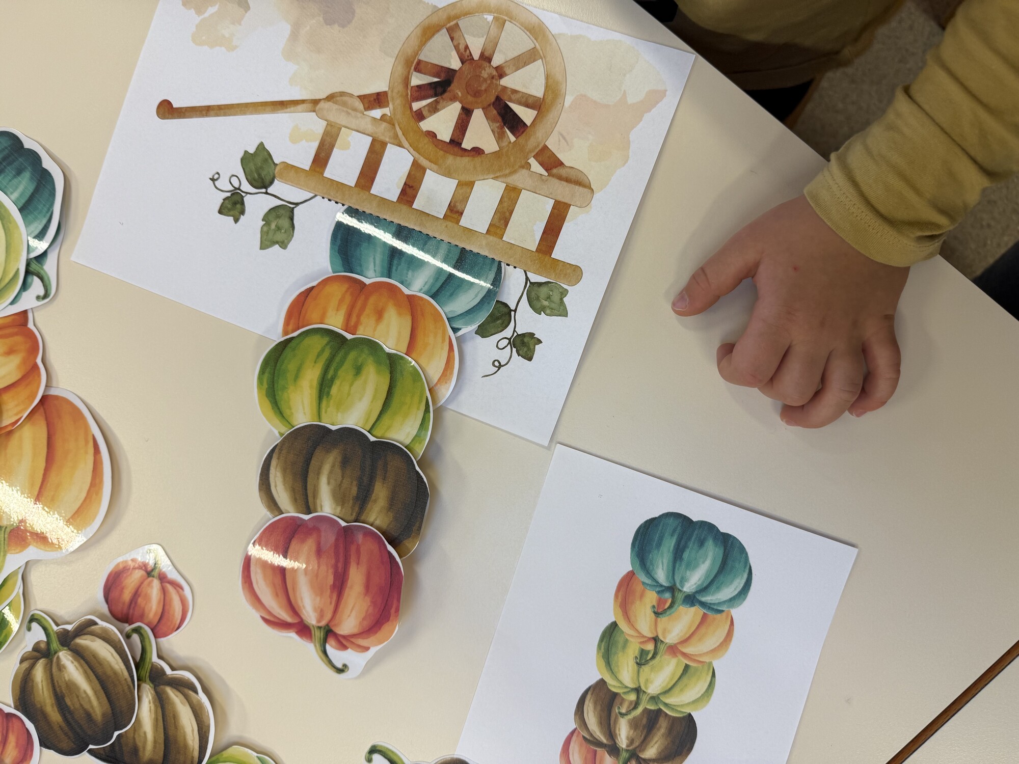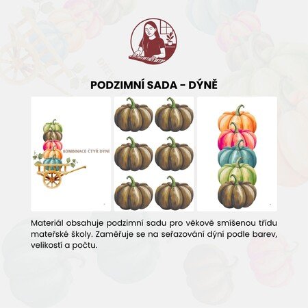 Tato sada je určena pro děti v mateřské škole a zaměřuje se na rozlišování barev a velikostí. Děti si mohou vyzkoušet seřazování barevných dýní do vozíku podle barvy, velikosti nebo počtu, což podporuje jejich pozornost a logické myšlení.