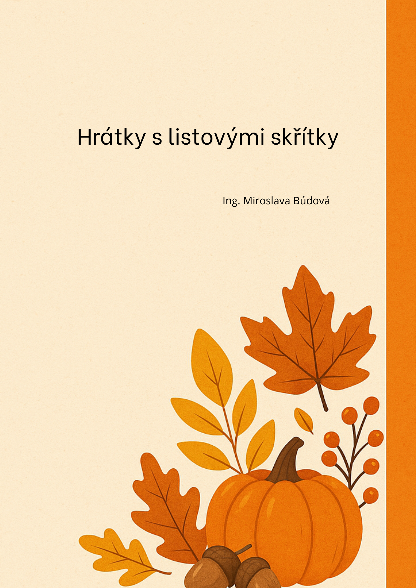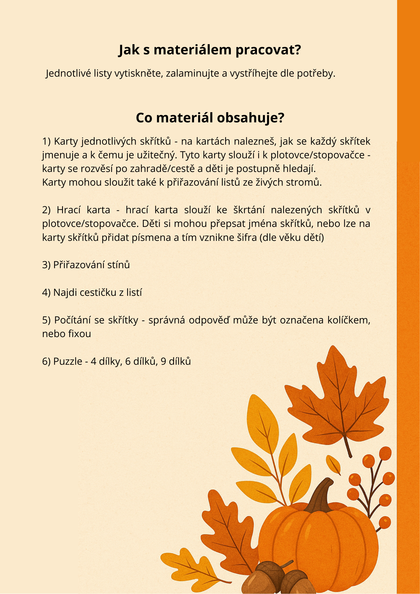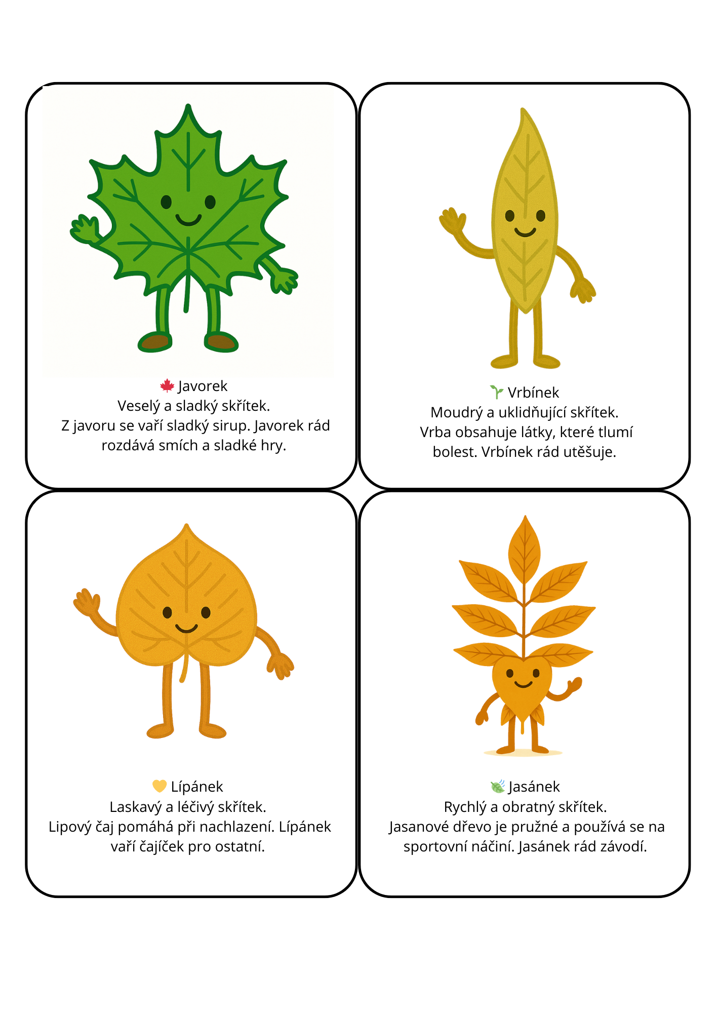 Když se potká fantazie s přírodou… vzniknou Listoví skřítci! V tomto materiálu jich je 10. Názvy dostali podle jednotlivých stromů. V materiálu najdete zábavné aktivity pro malé objevitele: hledání, přiřazování, počítání a puzzle. Součástí jsou i demonstrační karty jednotlivých skřítků, které lze použít na venkovní hru (plotovku) s možností tajenky. Materiál je vhodný pro děti od 2 do 6-7 let. Navazující aktivitou může být hledání listů v přírodě a určování stromů. Výtvarnou činností může být vytvoření vlastního skřítka obtiskem listů.
