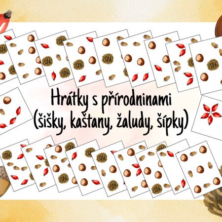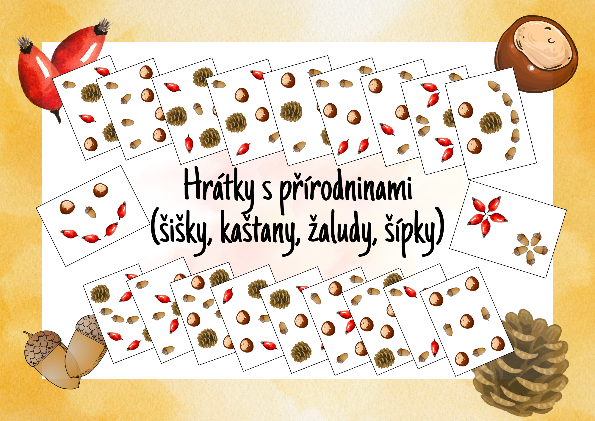 - smysluplné využití přírodních materiálů (lze je nechat smíchané a nechat děti hledat nebo rozdělit dle druhu)