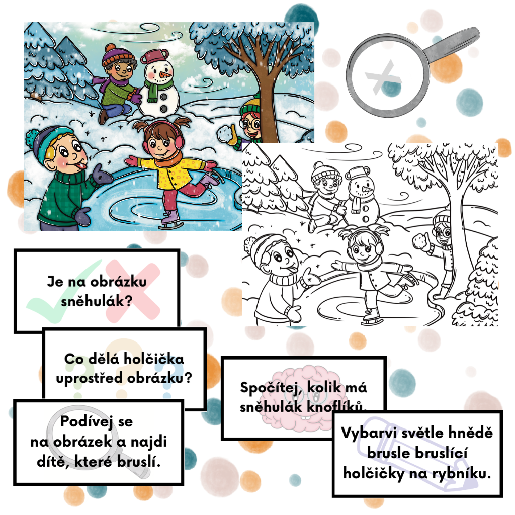 - Hledání – děti mají za úkol najít konkrétní prvky na obrázku.